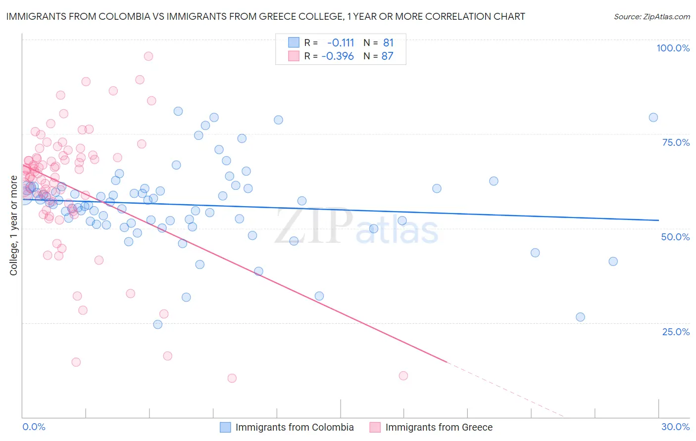 Immigrants from Colombia vs Immigrants from Greece College, 1 year or more Correlation Chart