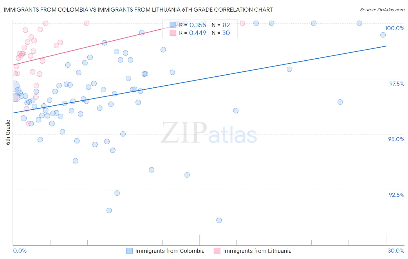 Immigrants from Colombia vs Immigrants from Lithuania 6th Grade Correlation Chart