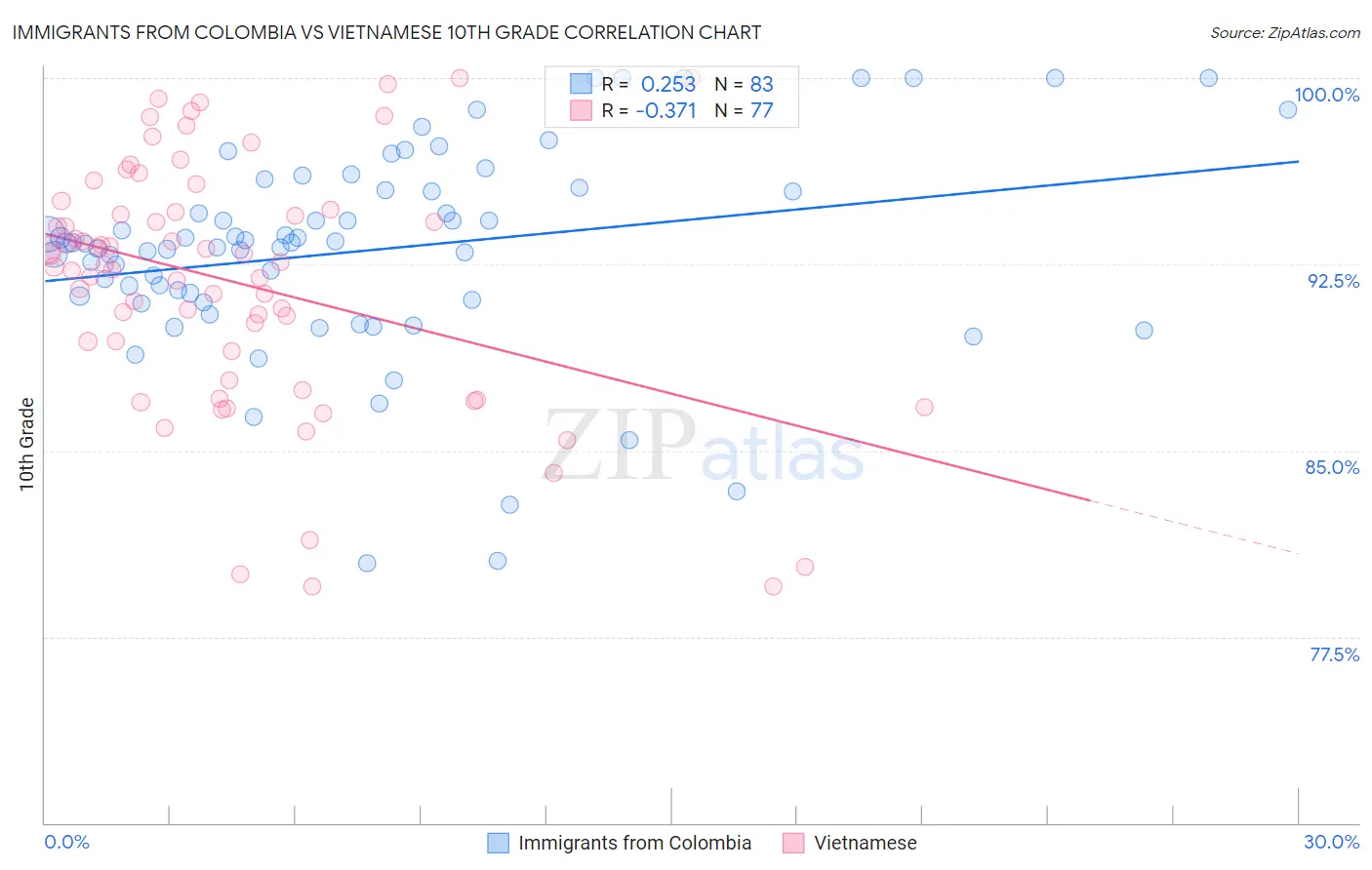 Immigrants from Colombia vs Vietnamese 10th Grade Correlation Chart