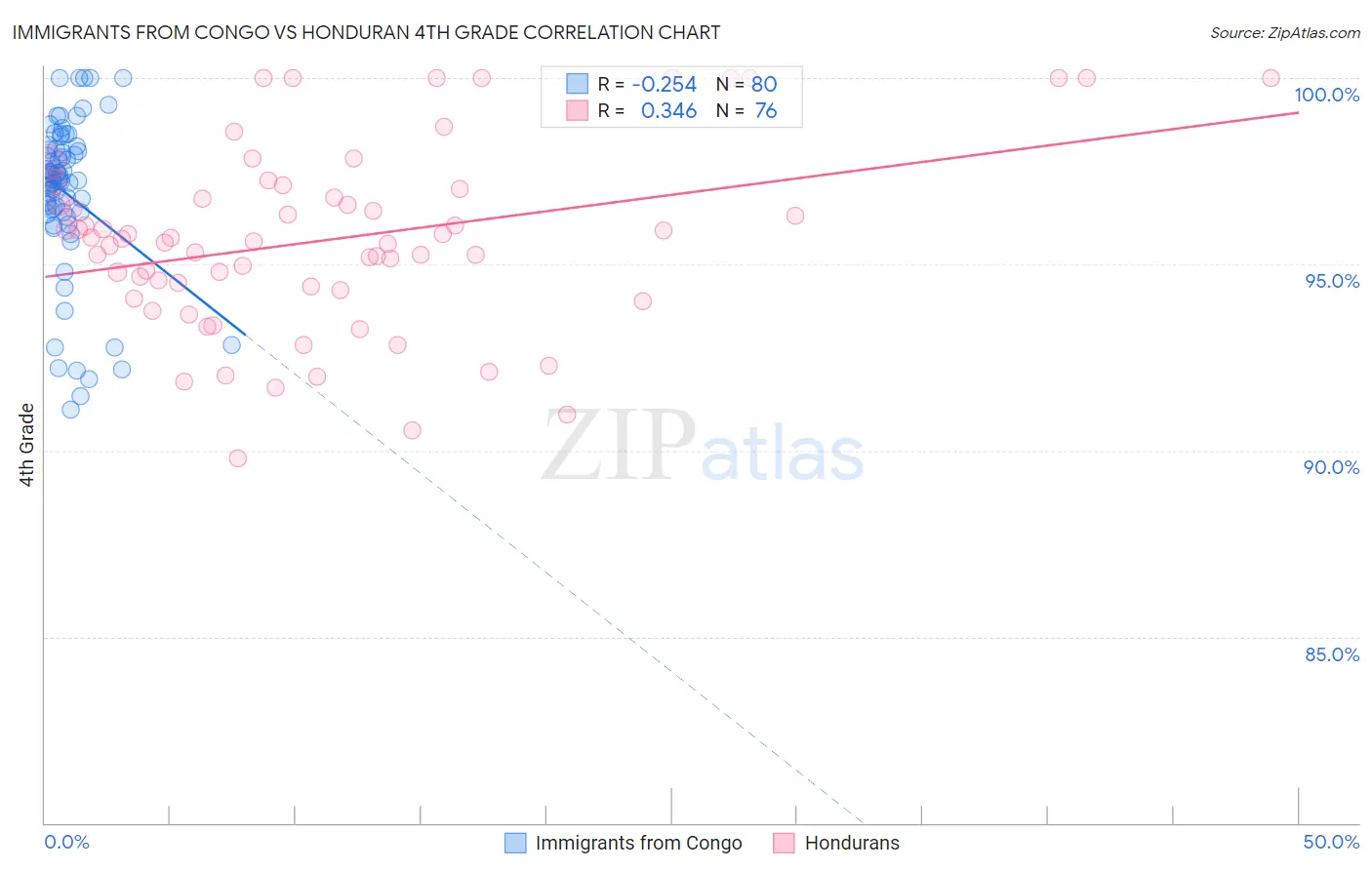 Immigrants from Congo vs Honduran 4th Grade Correlation Chart
