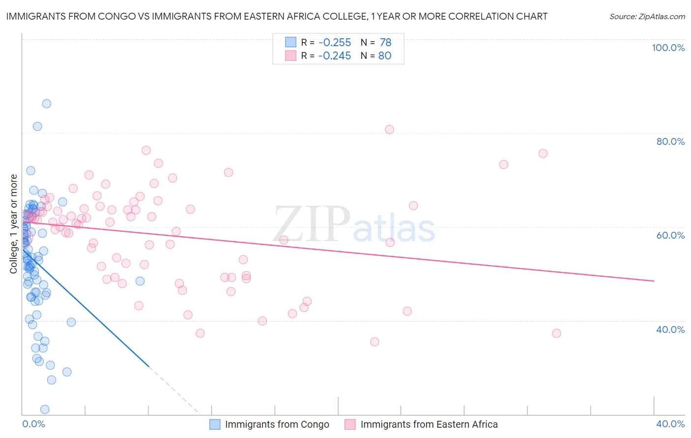 Immigrants from Congo vs Immigrants from Eastern Africa College, 1 year or more Correlation Chart