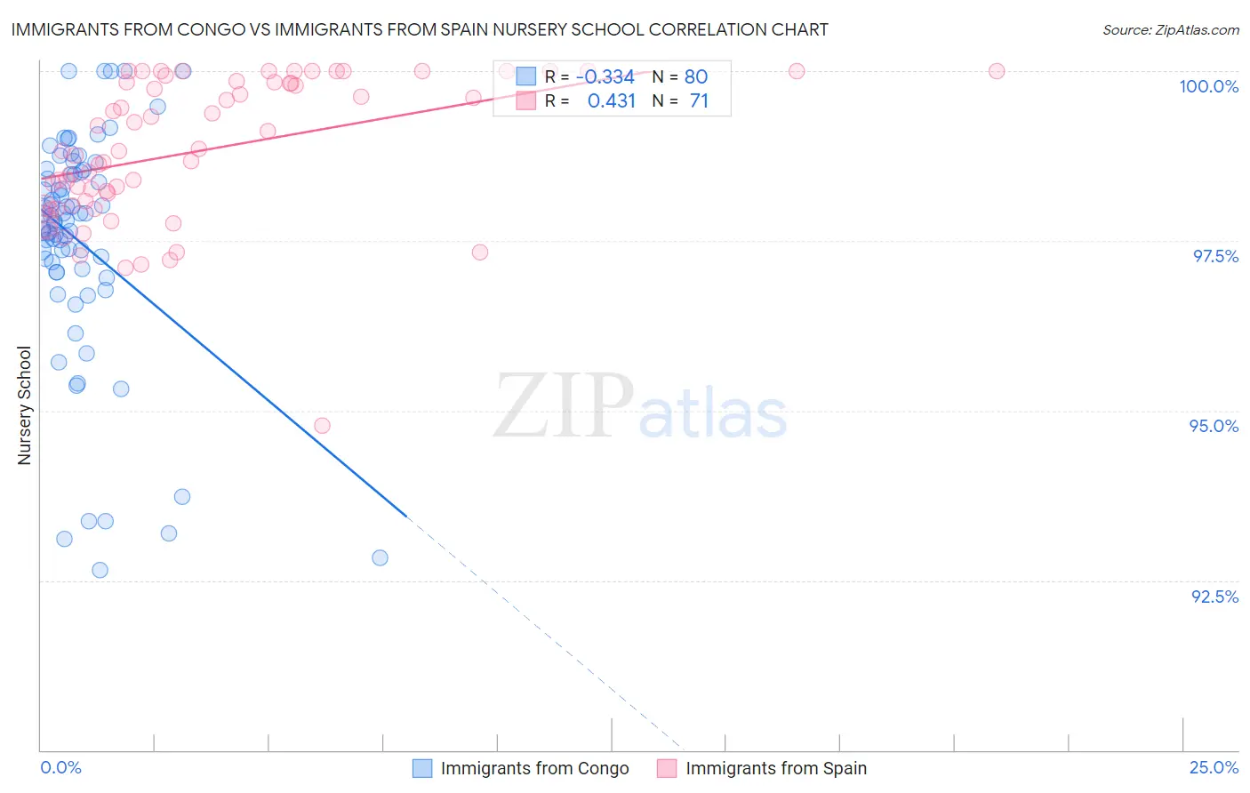 Immigrants from Congo vs Immigrants from Spain Nursery School Correlation Chart
