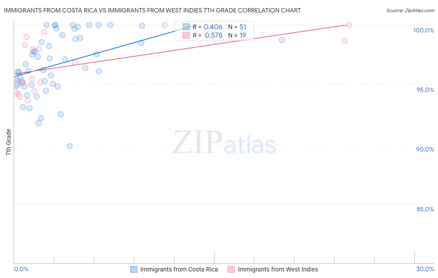 Immigrants from Costa Rica vs Immigrants from West Indies 7th Grade Correlation Chart