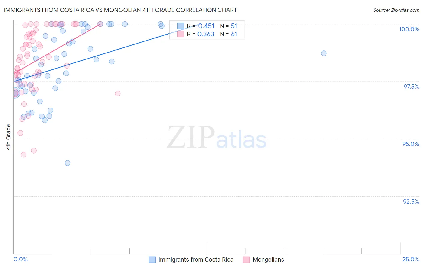 Immigrants from Costa Rica vs Mongolian 4th Grade Correlation Chart