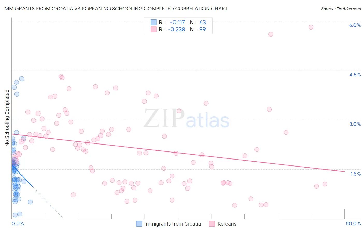 Immigrants from Croatia vs Korean No Schooling Completed Correlation Chart
