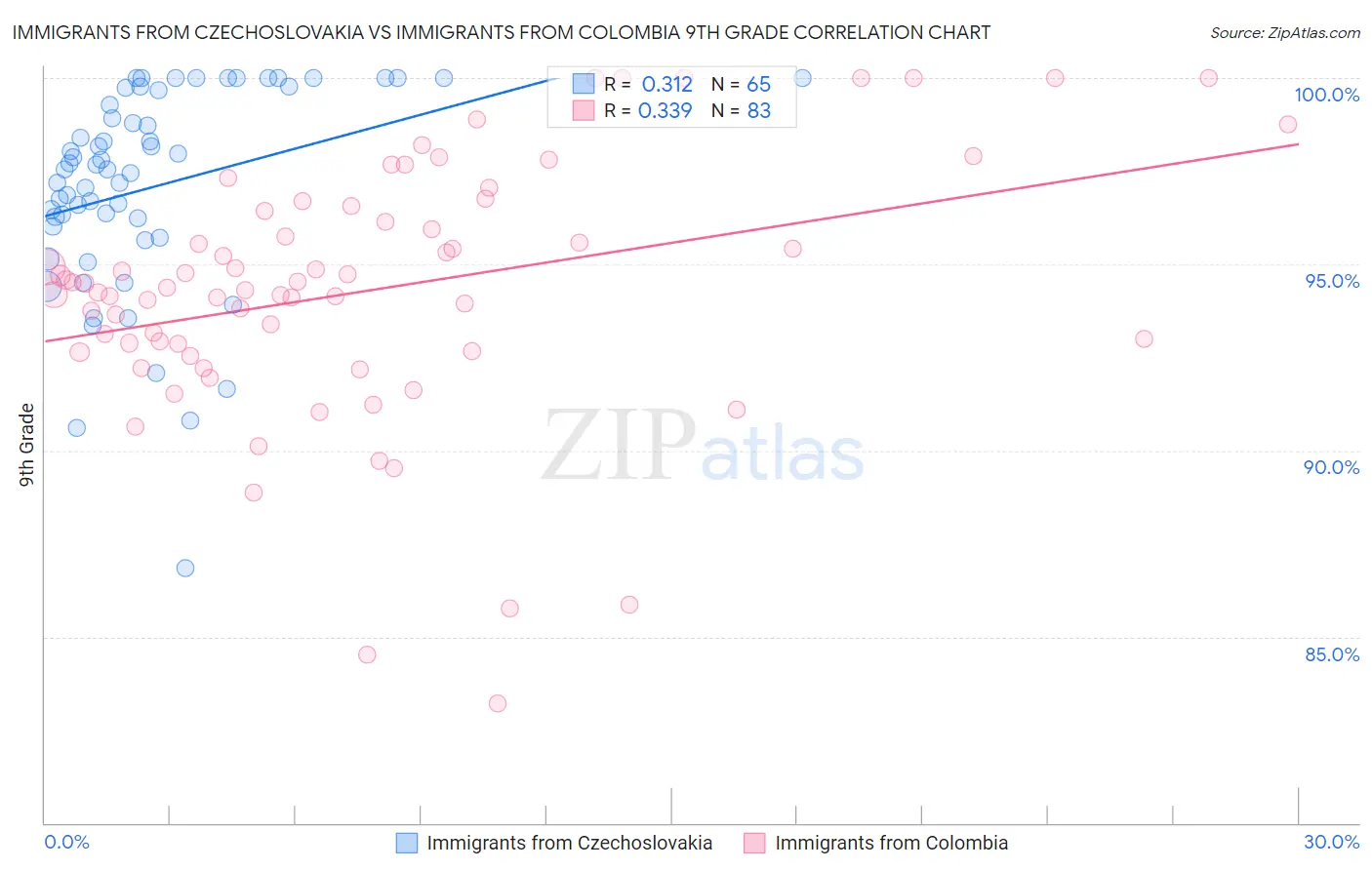 Immigrants from Czechoslovakia vs Immigrants from Colombia 9th Grade Correlation Chart