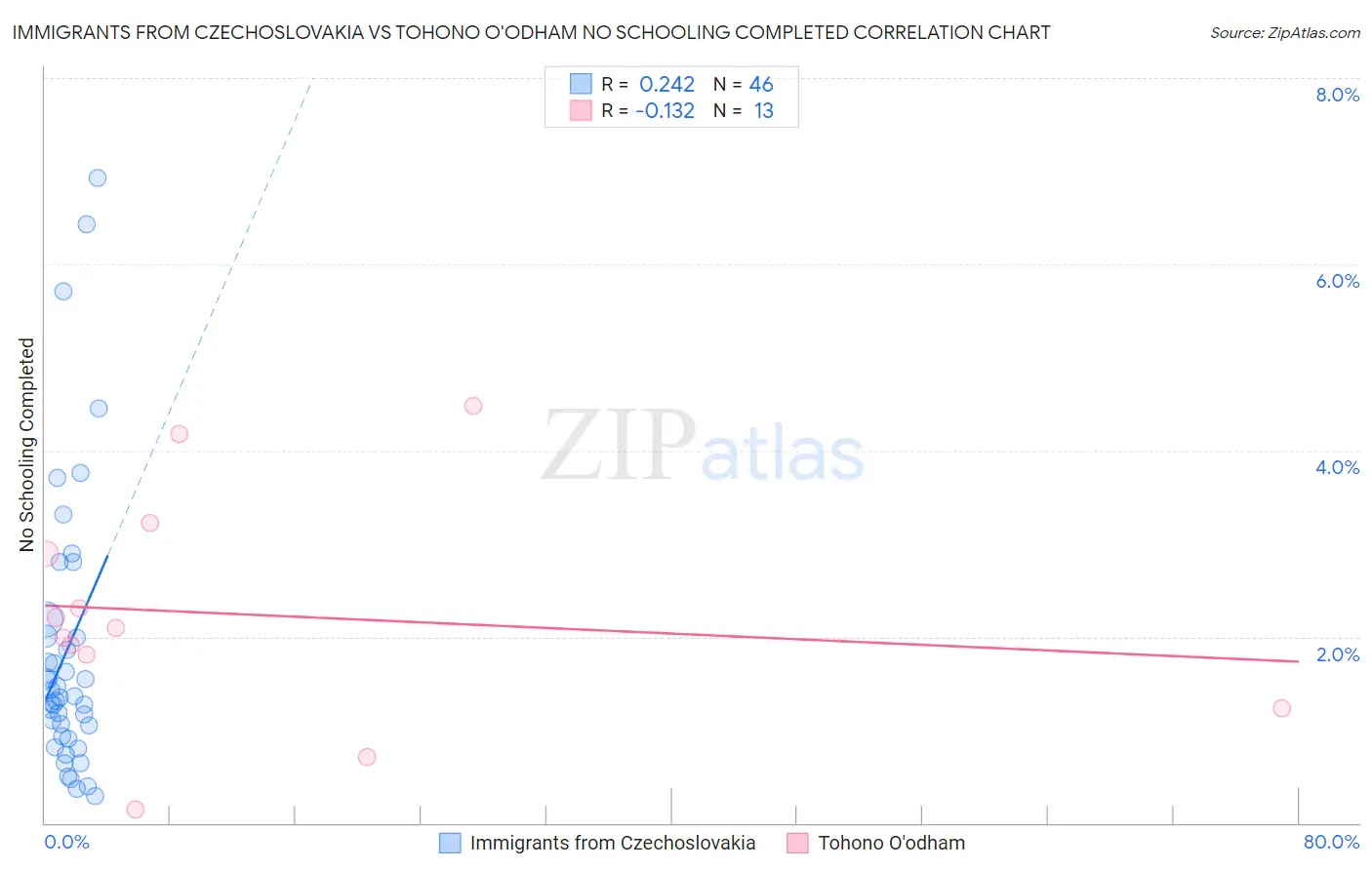 Immigrants from Czechoslovakia vs Tohono O'odham No Schooling Completed Correlation Chart