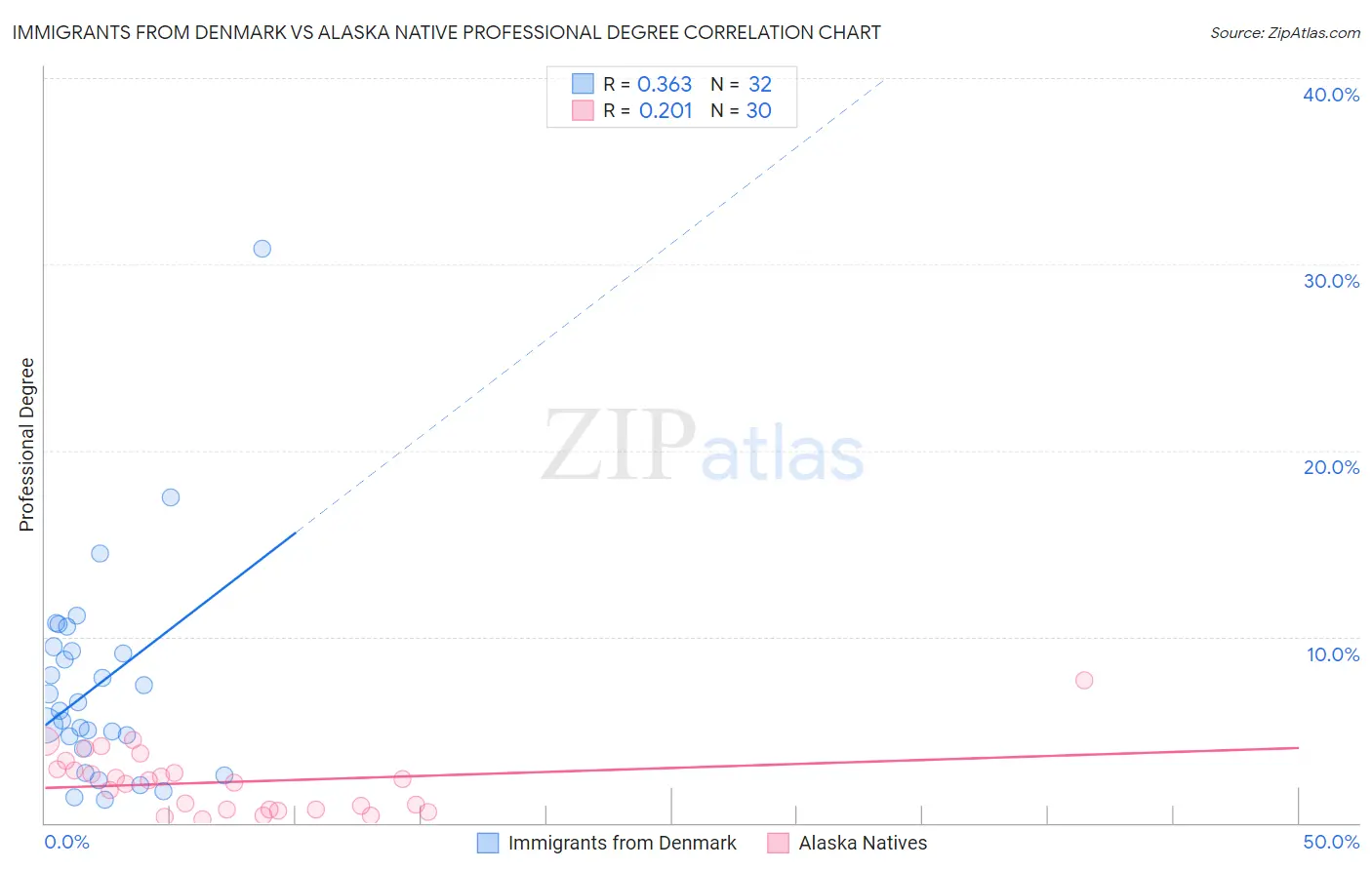 Immigrants from Denmark vs Alaska Native Professional Degree Correlation Chart
