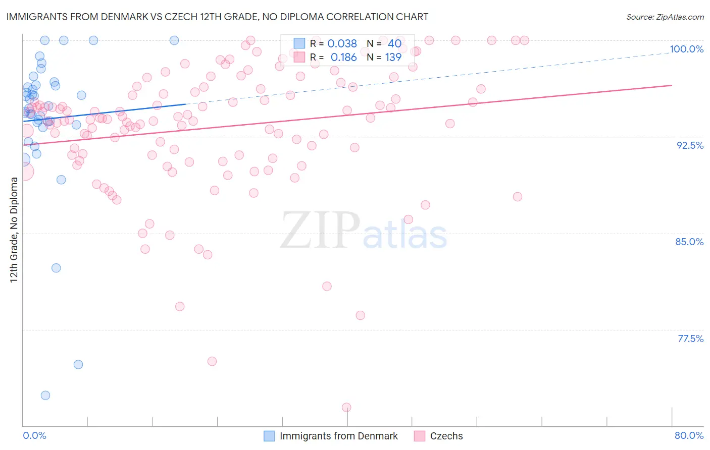 Immigrants from Denmark vs Czech 12th Grade, No Diploma Correlation Chart