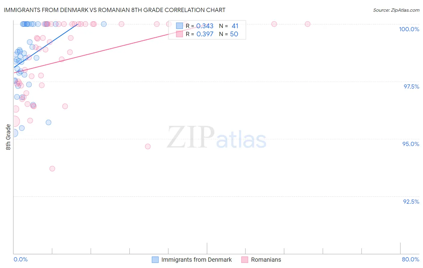 Immigrants from Denmark vs Romanian 8th Grade Correlation Chart