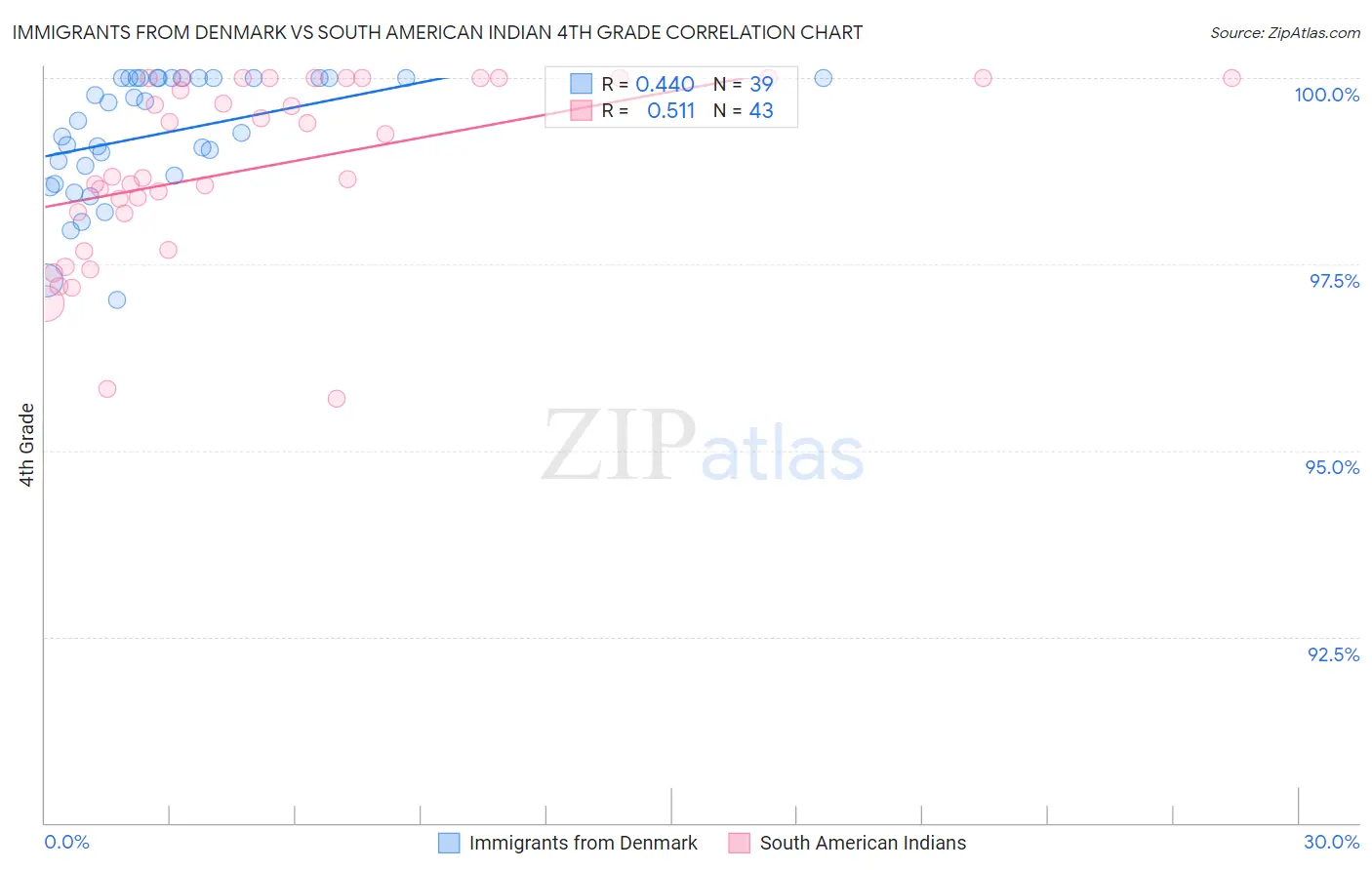Immigrants from Denmark vs South American Indian 4th Grade Correlation Chart