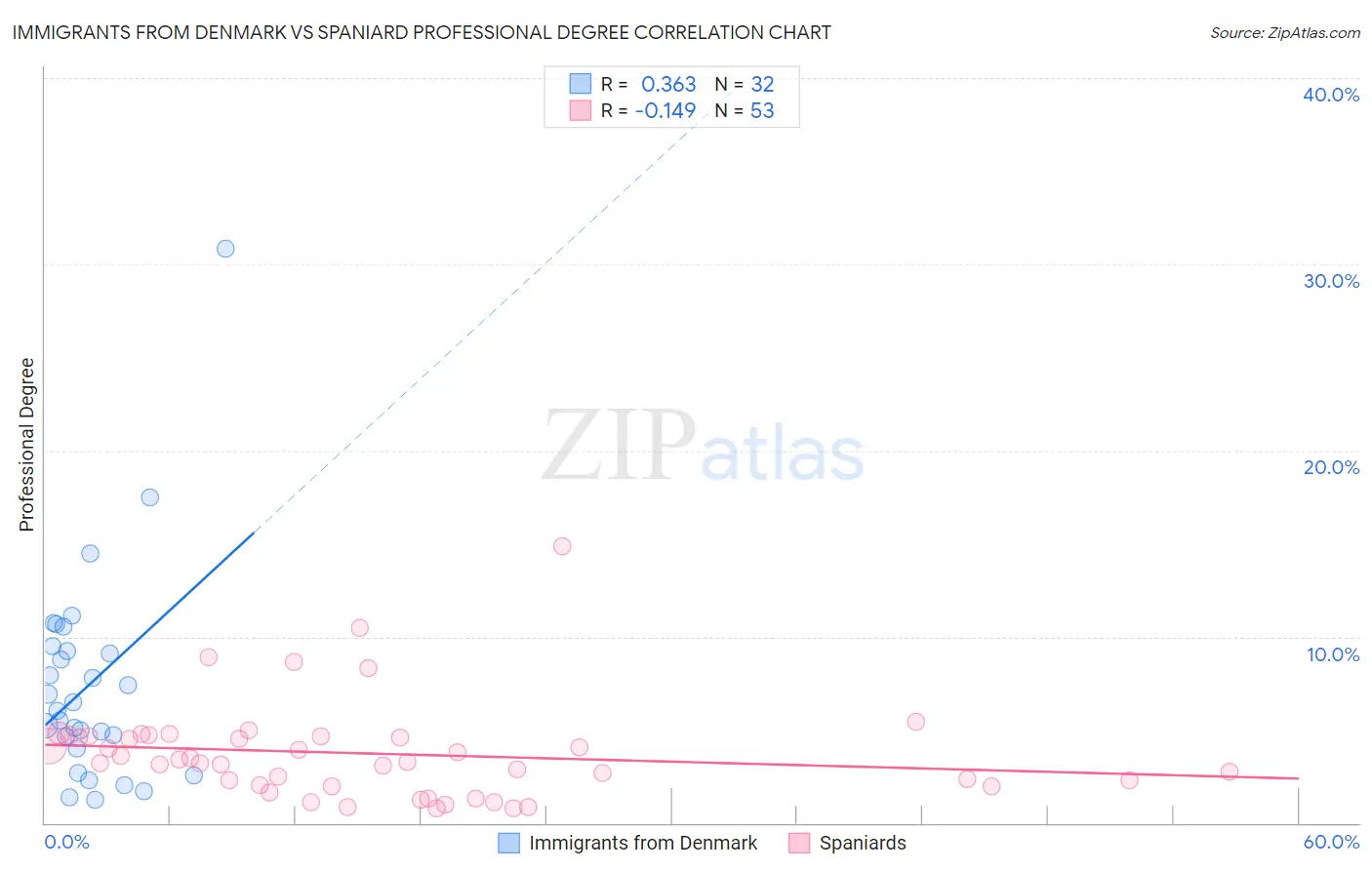 Immigrants from Denmark vs Spaniard Professional Degree Correlation Chart