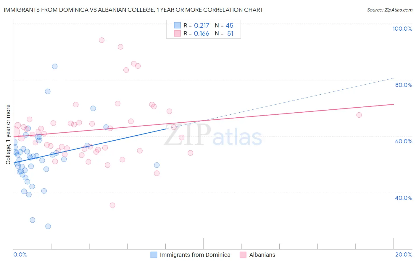 Immigrants from Dominica vs Albanian College, 1 year or more Correlation Chart