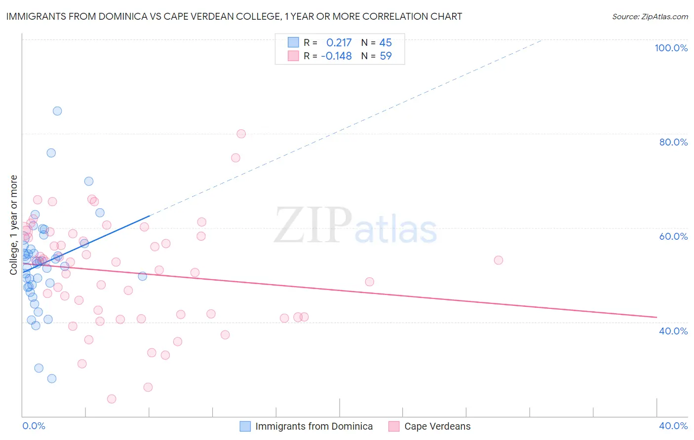 Immigrants from Dominica vs Cape Verdean College, 1 year or more Correlation Chart