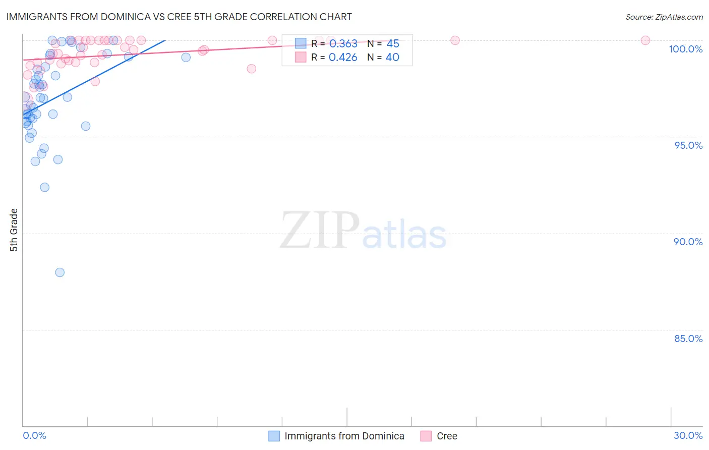 Immigrants from Dominica vs Cree 5th Grade Correlation Chart