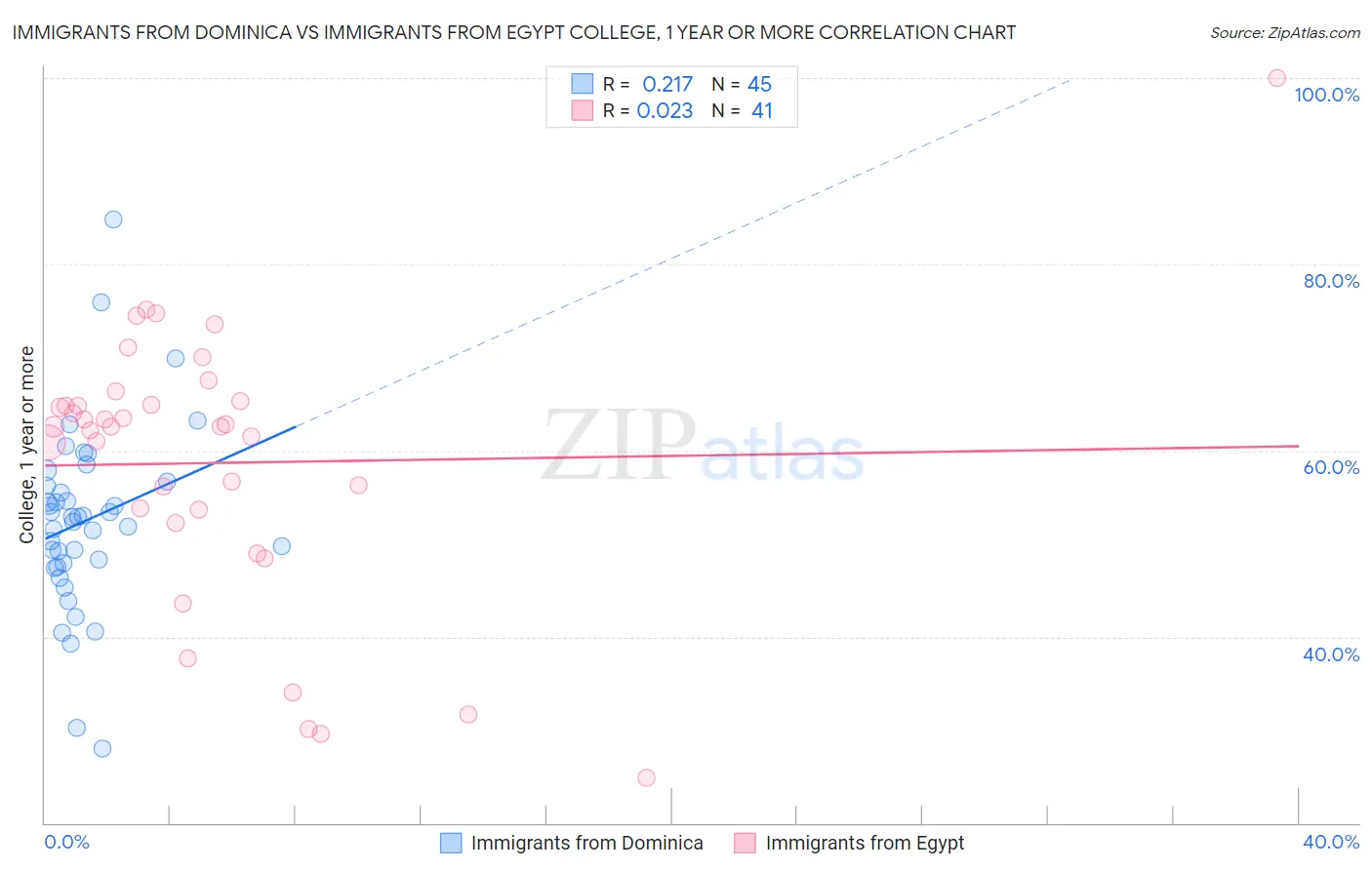 Immigrants from Dominica vs Immigrants from Egypt College, 1 year or more Correlation Chart