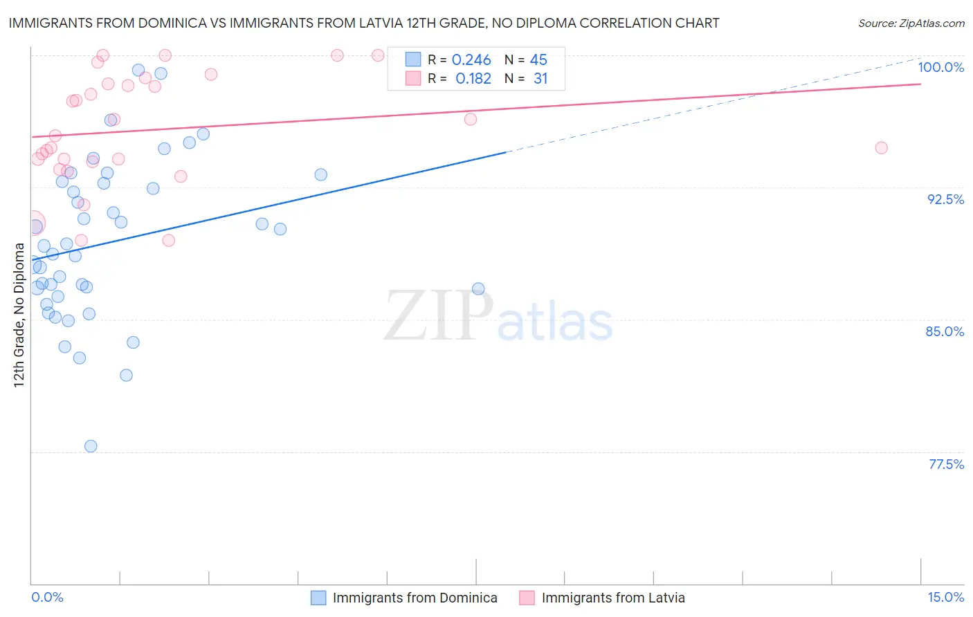 Immigrants from Dominica vs Immigrants from Latvia 12th Grade, No Diploma Correlation Chart