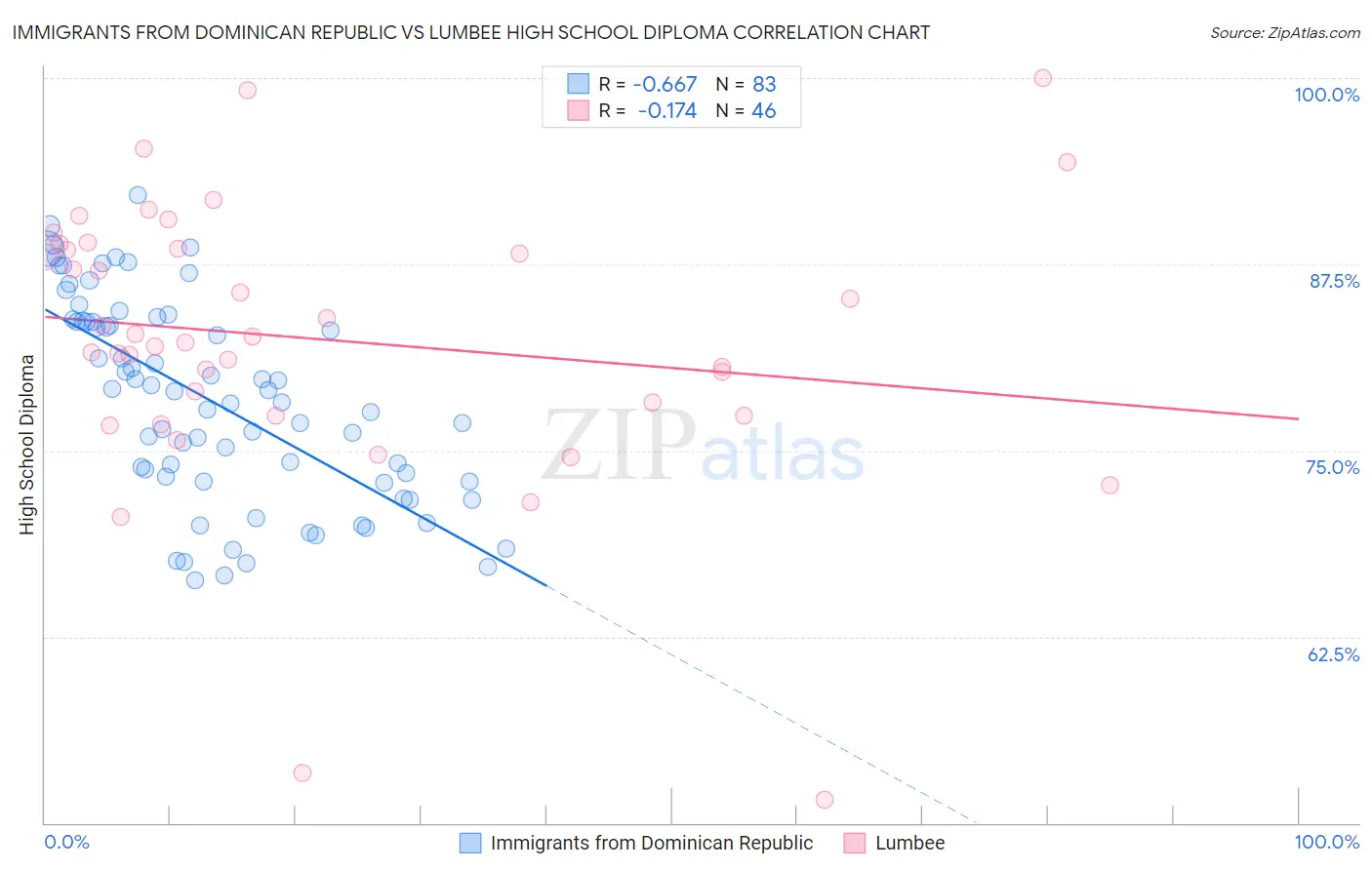 Immigrants from Dominican Republic vs Lumbee High School Diploma Correlation Chart