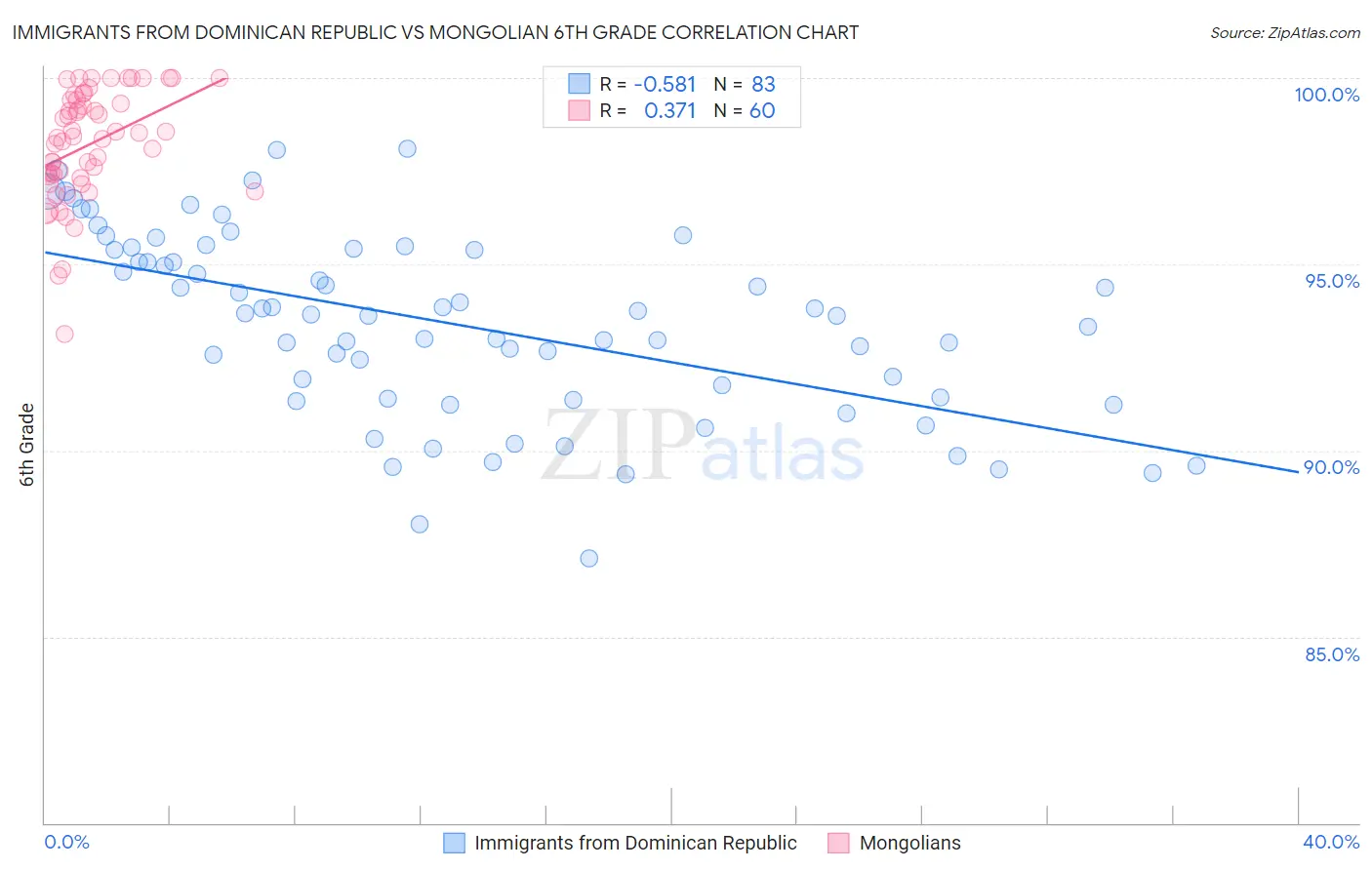 Immigrants from Dominican Republic vs Mongolian 6th Grade Correlation Chart