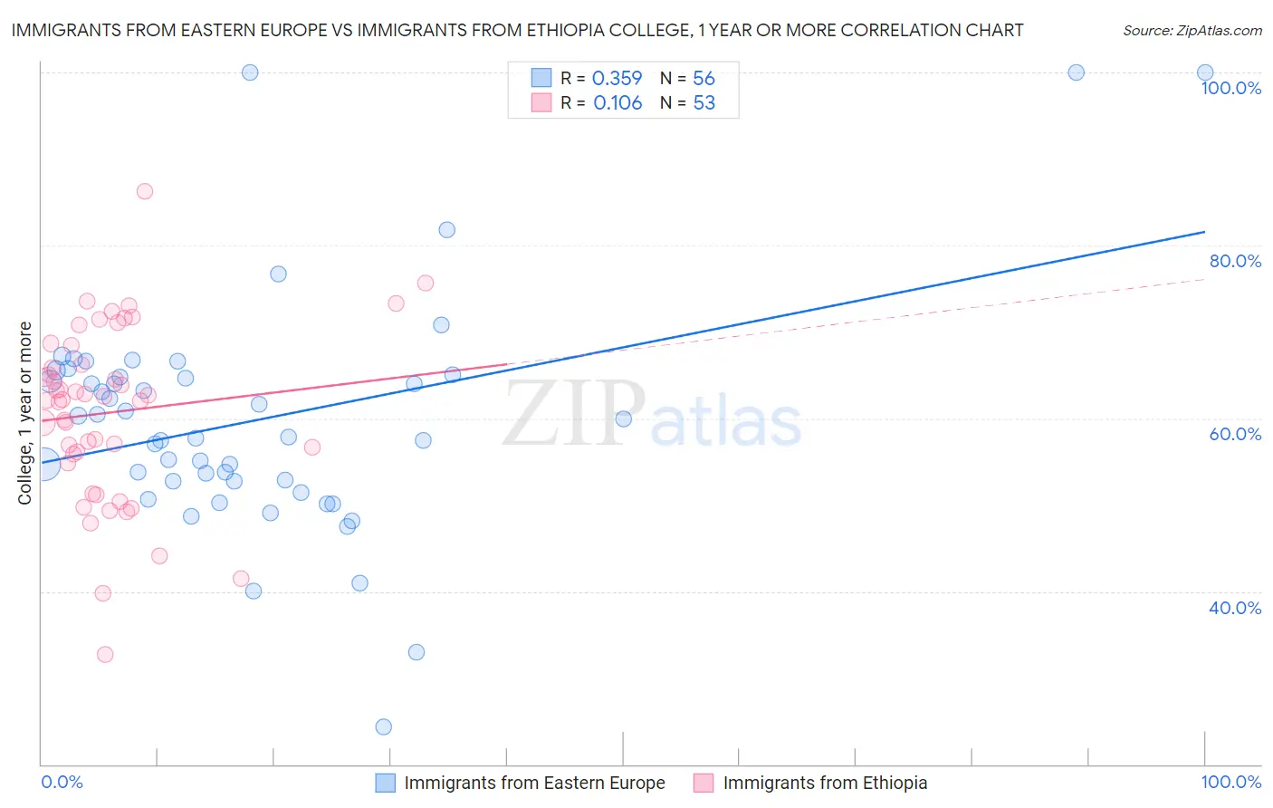 Immigrants from Eastern Europe vs Immigrants from Ethiopia College, 1 year or more Correlation Chart