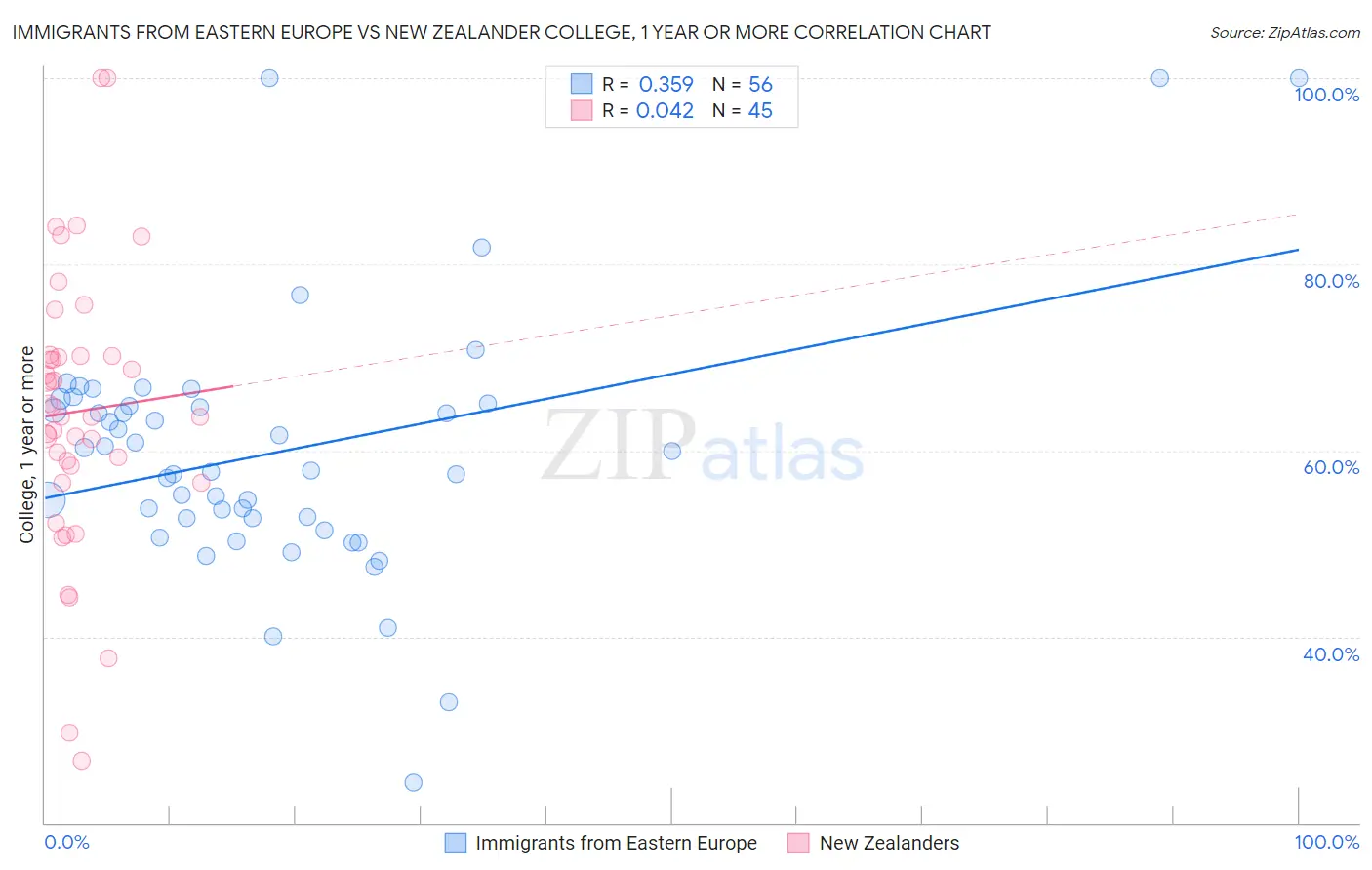 Immigrants from Eastern Europe vs New Zealander College, 1 year or more Correlation Chart