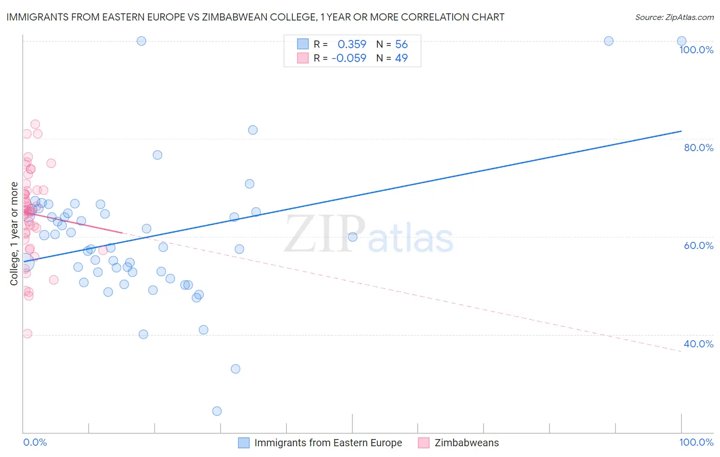 Immigrants from Eastern Europe vs Zimbabwean College, 1 year or more Correlation Chart