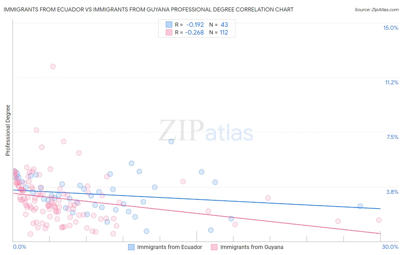 The statistical analysis conducted on geographies consisting of 270,711,574 people shows a poor negative correlation between the proportion of Immigrants from Ecuador and percentage of population with at least professional degree education in the United States with a correlation coefficient (R) of -0.192 and weighted average of 3.8%. Similarly, the statistical analysis conducted on geographies consisting of 183,575,789 people shows a weak negative correlation between the proportion of Immigrants from Guyana and percentage of population with at least professional degree education in the United States with a correlation coefficient (R) of -0.268 and weighted average of 3.7%, a difference of 3.8%.