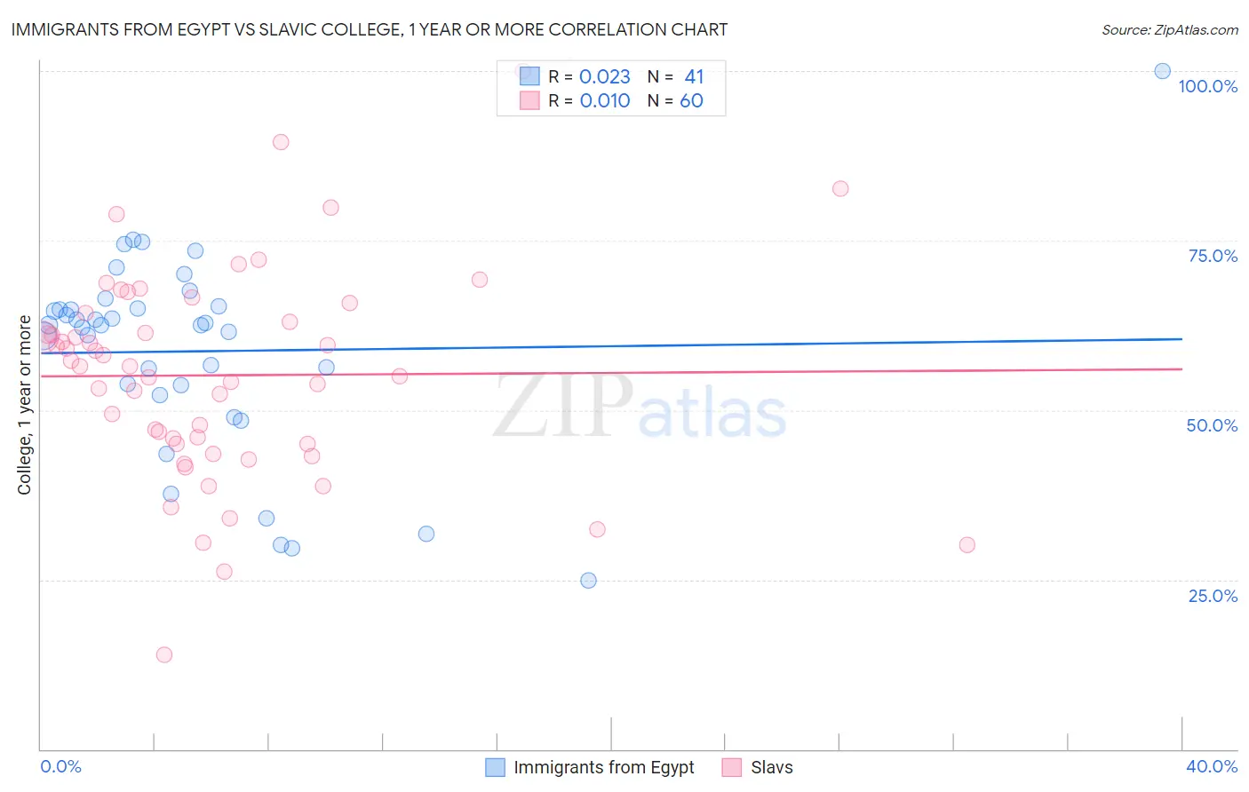 Immigrants from Egypt vs Slavic College, 1 year or more Correlation Chart