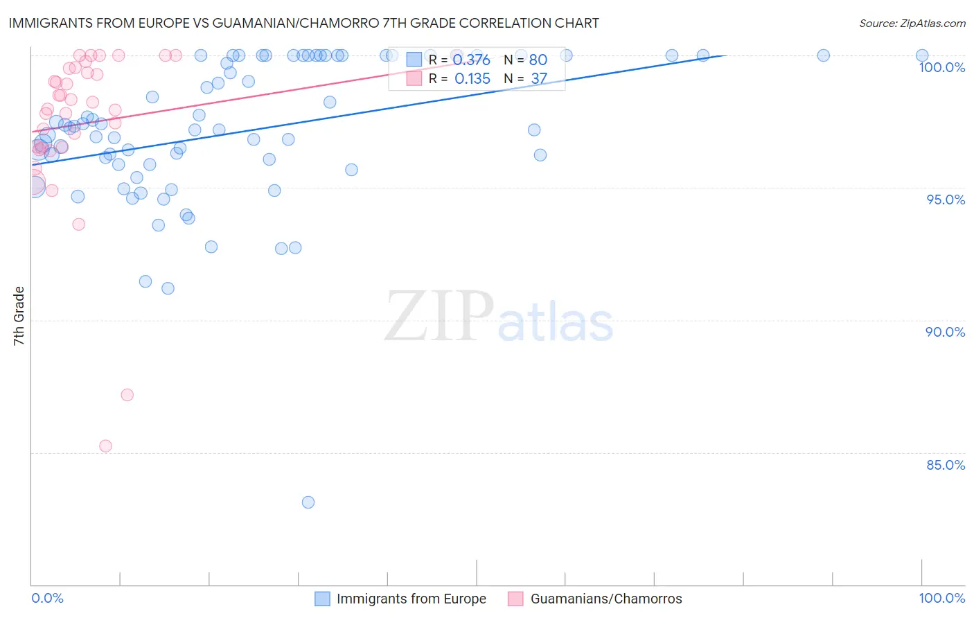 In terms of 7th grade, the demographic groups most similar to Immigrants from Europe are Cheyenne (96.5%, a difference of 0.0%), Immigrants from France (96.5%, a difference of 0.0%), Immigrants from Norway (96.5%, a difference of 0.010%), Immigrants from Croatia (96.5%, a difference of 0.010%), and Immigrants from Switzerland (96.5%, a difference of 0.010%).