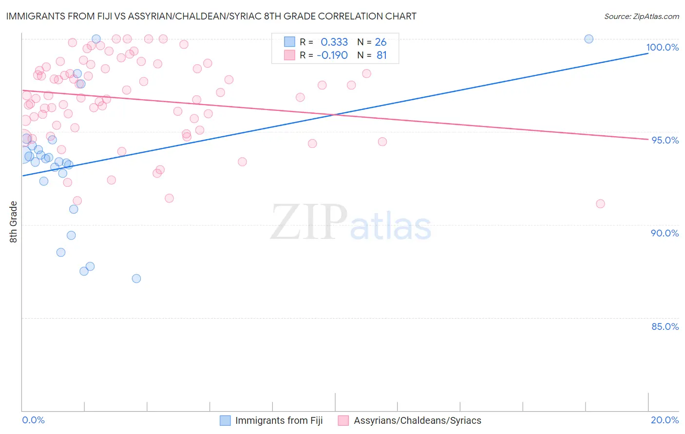 Immigrants from Fiji vs Assyrian/Chaldean/Syriac 8th Grade Correlation Chart