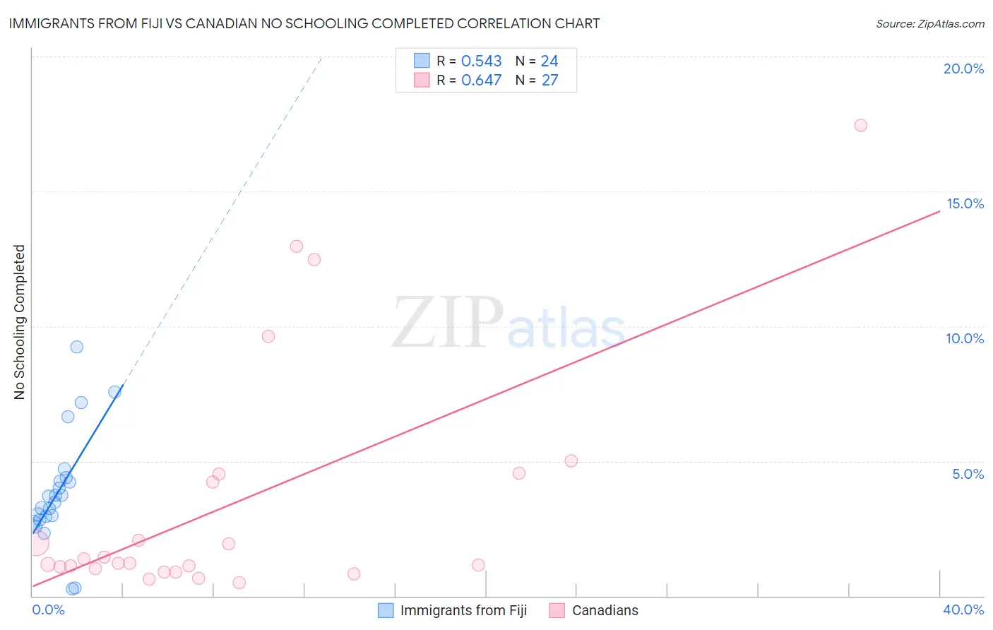 Immigrants from Fiji vs Canadian No Schooling Completed Correlation Chart