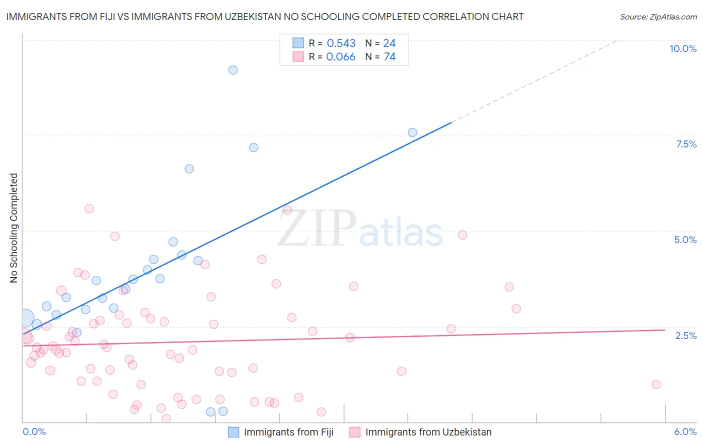 Immigrants from Fiji vs Immigrants from Uzbekistan No Schooling Completed Correlation Chart