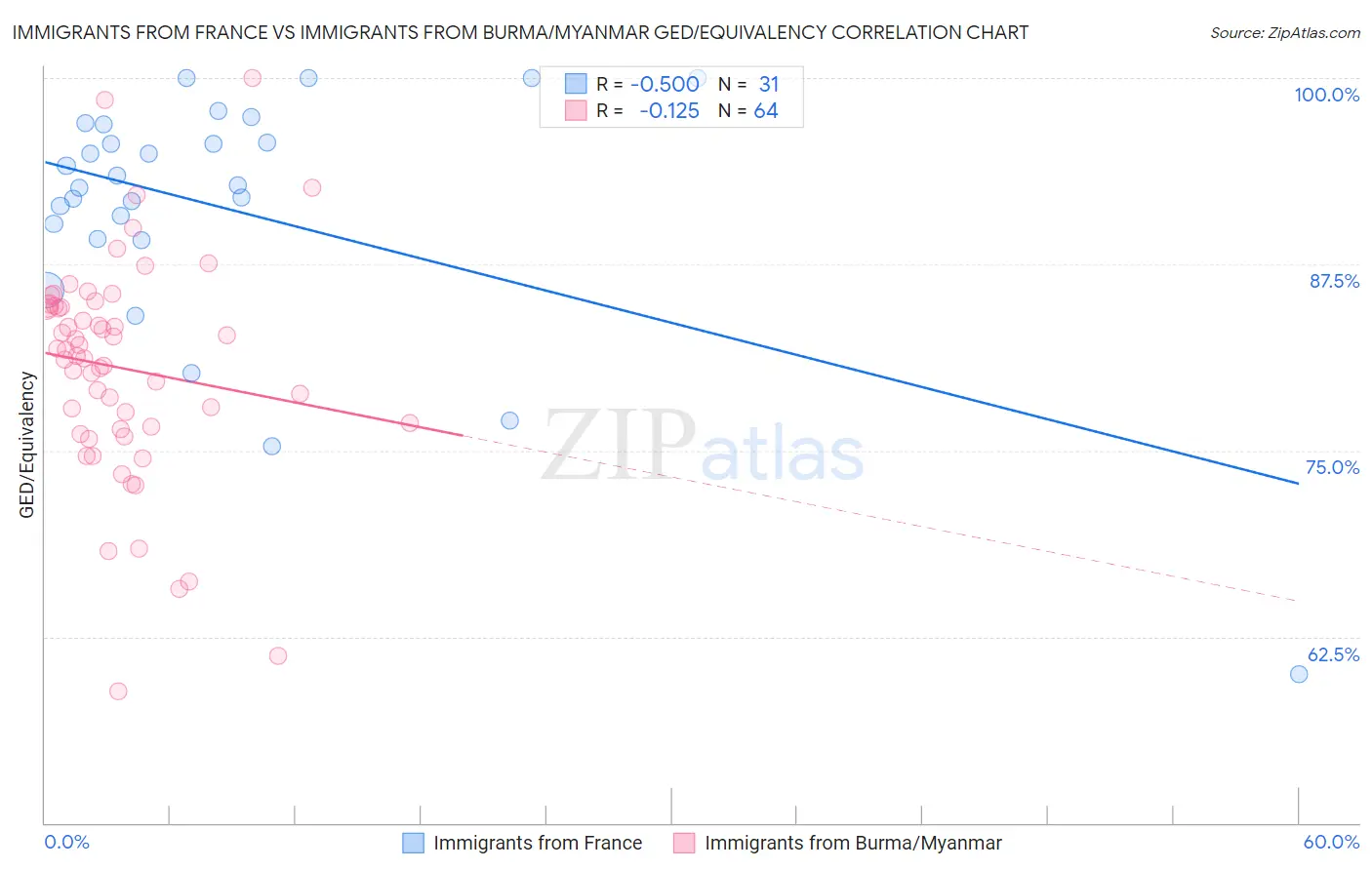 Immigrants from France vs Immigrants from Burma/Myanmar GED/Equivalency