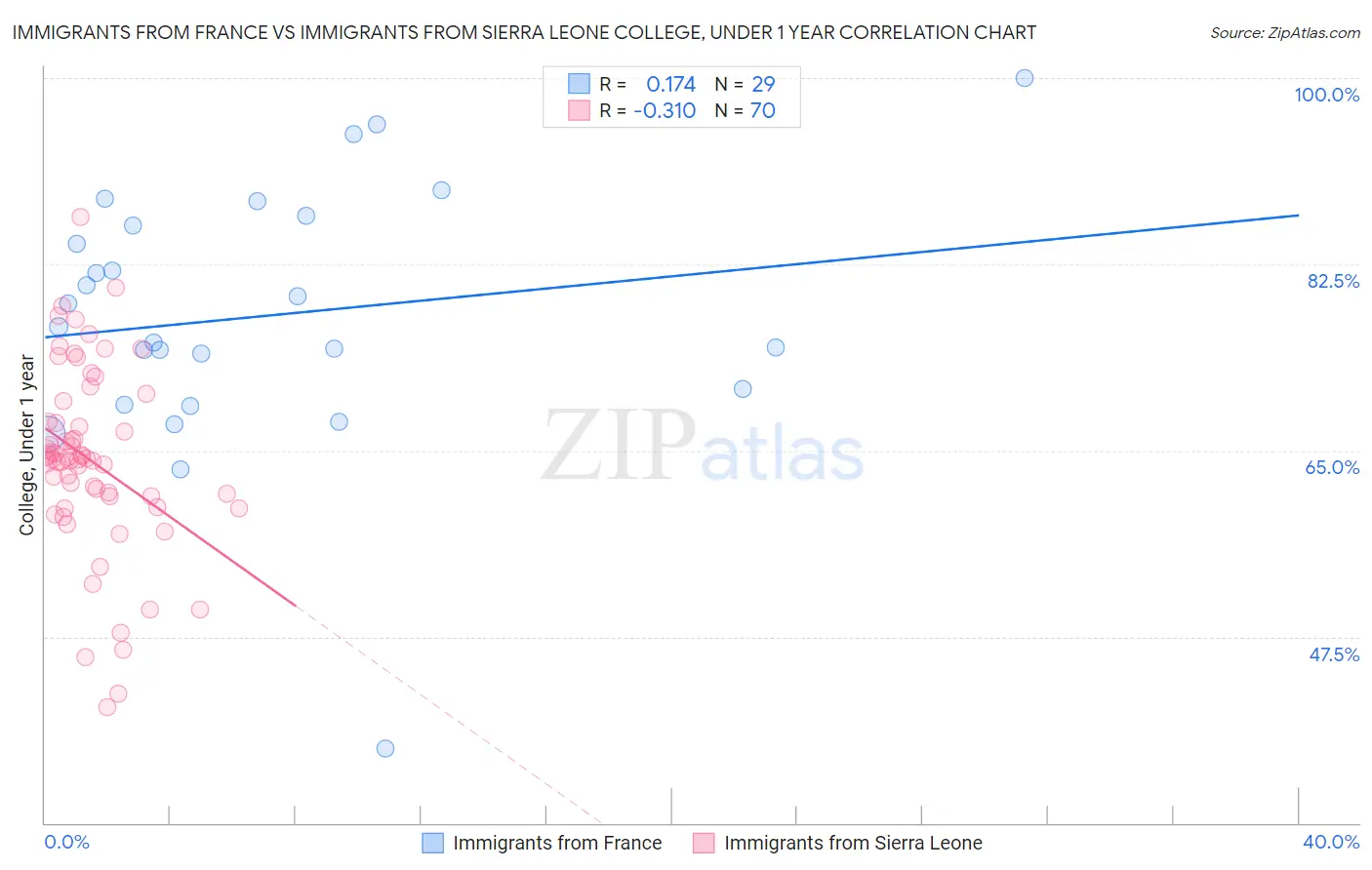 Immigrants from France vs Immigrants from Sierra Leone College, Under 1 year Correlation Chart