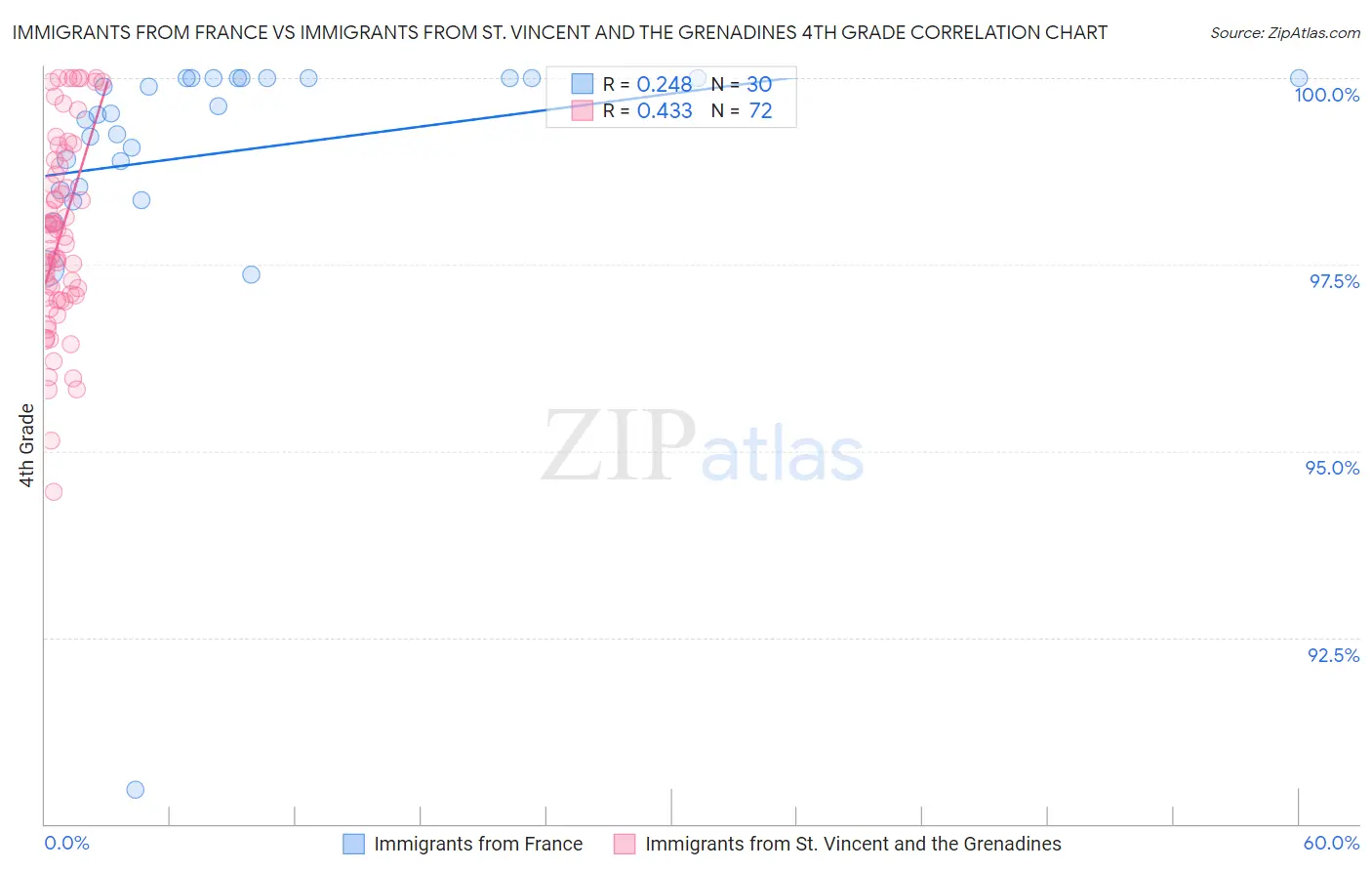 Immigrants from France vs Immigrants from St. Vincent and the Grenadines 4th Grade Correlation Chart