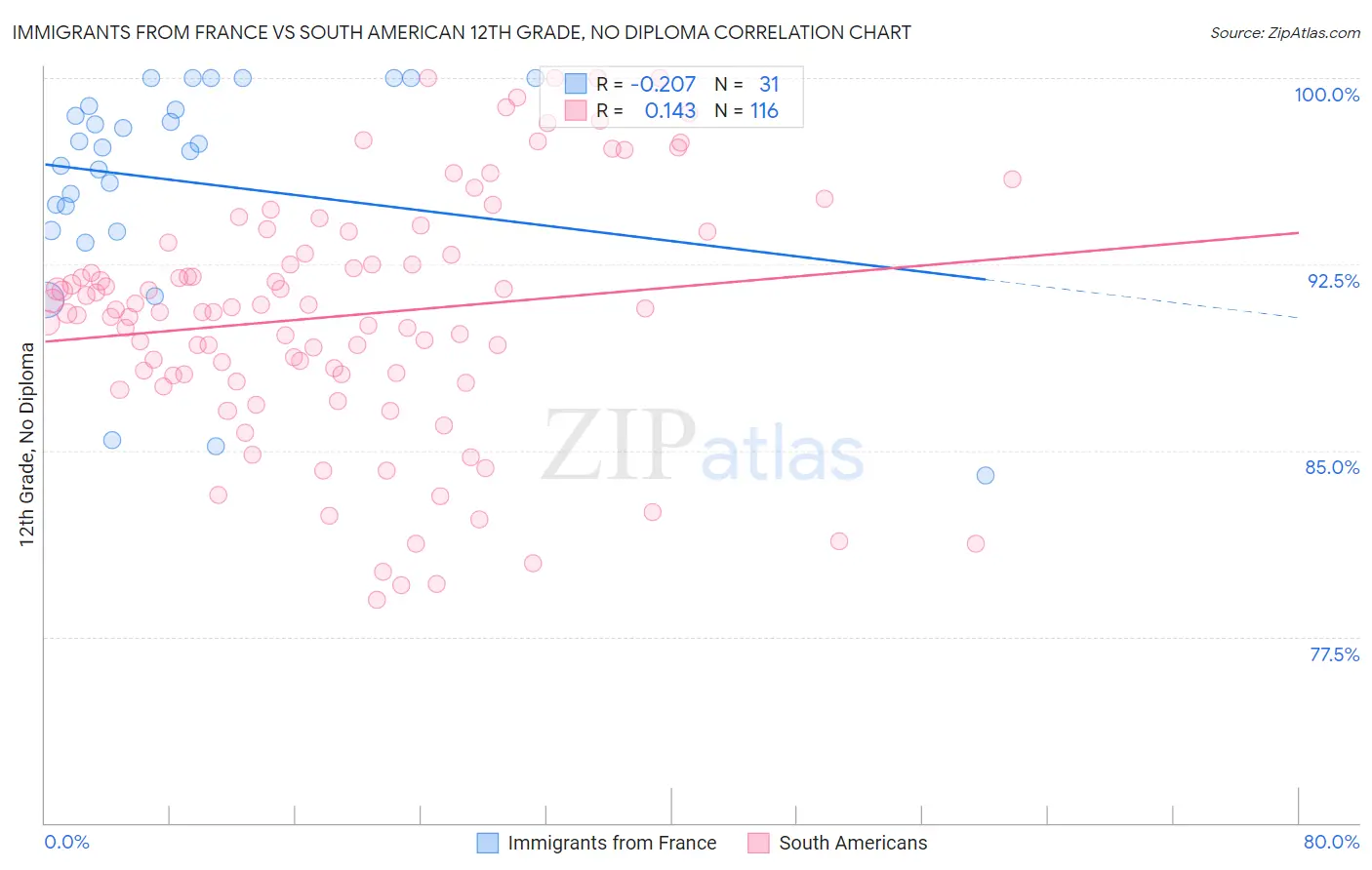 Immigrants from France vs South American 12th Grade, No Diploma Correlation Chart
