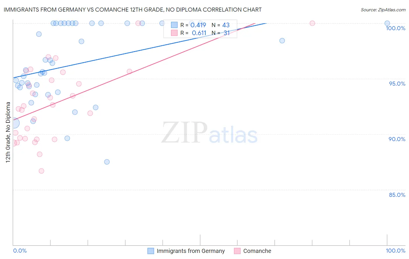 Immigrants from Germany vs Comanche 12th Grade, No Diploma Correlation Chart