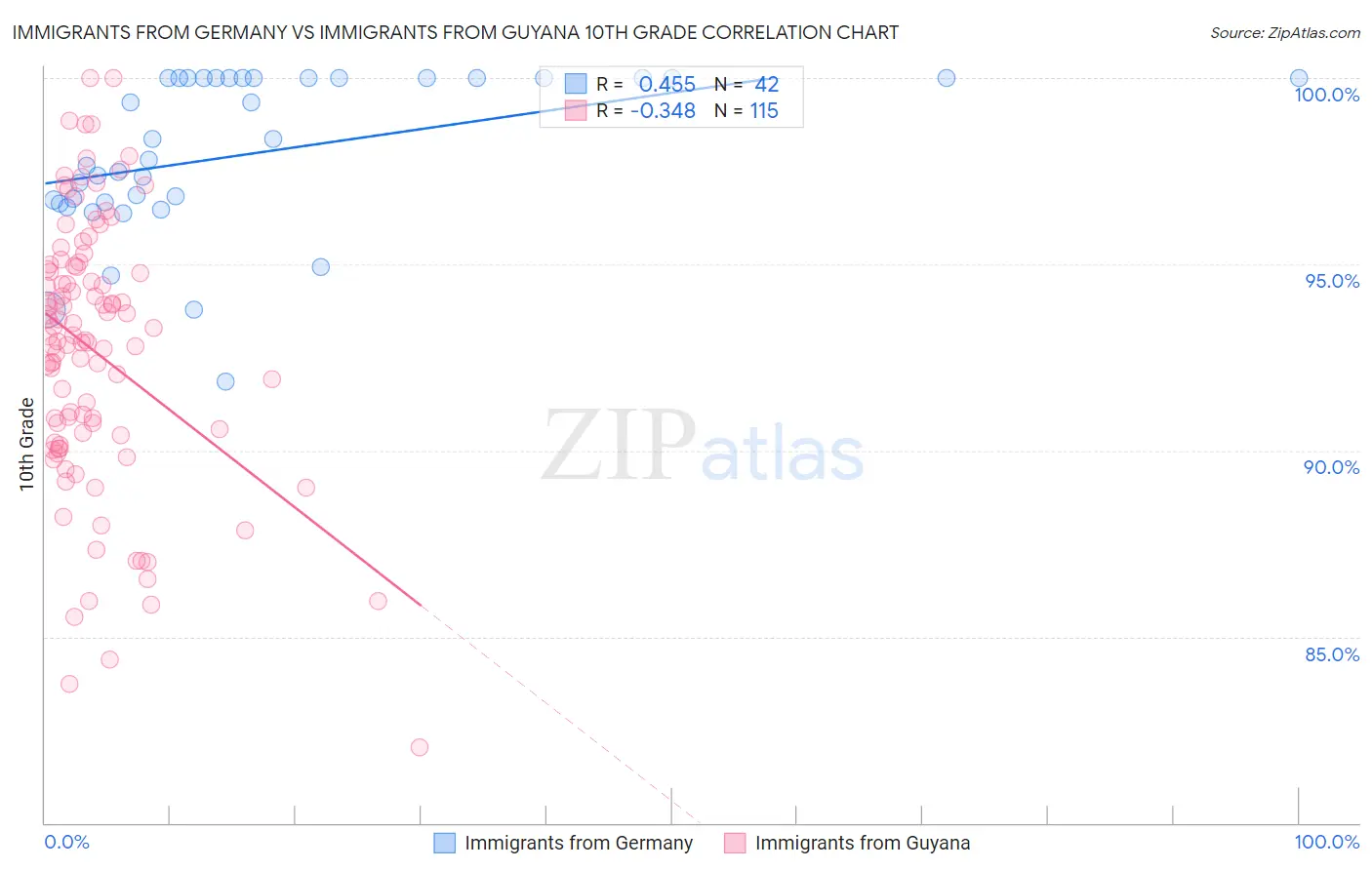 Immigrants from Germany vs Immigrants from Guyana 10th Grade Correlation Chart