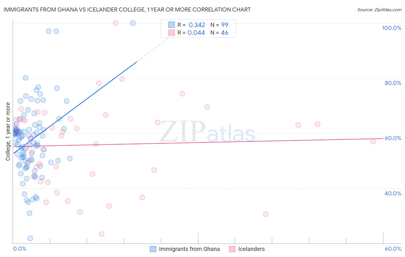 Immigrants from Ghana vs Icelander College, 1 year or more Correlation Chart