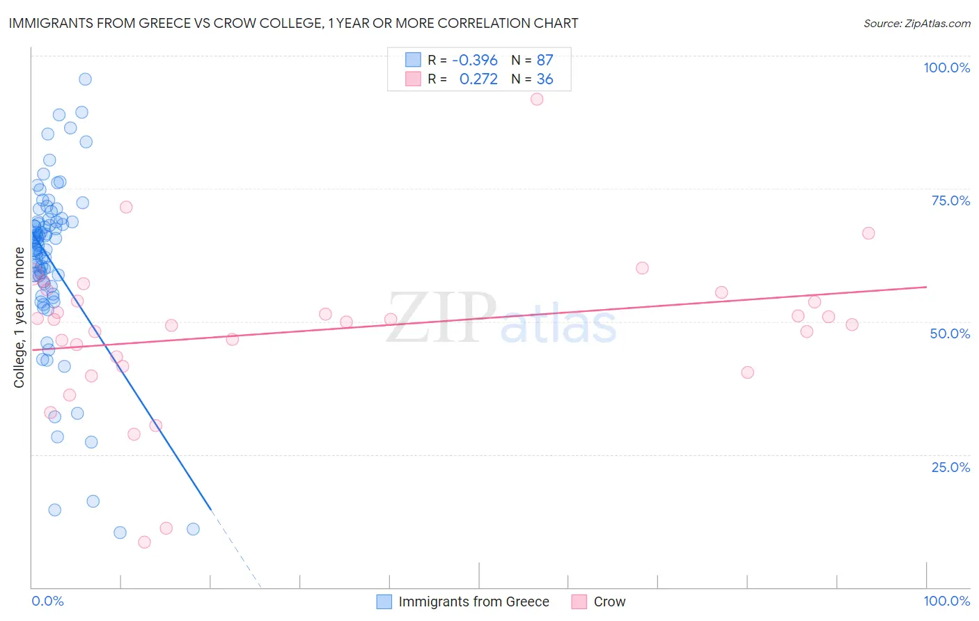 Immigrants from Greece vs Crow College, 1 year or more Correlation Chart