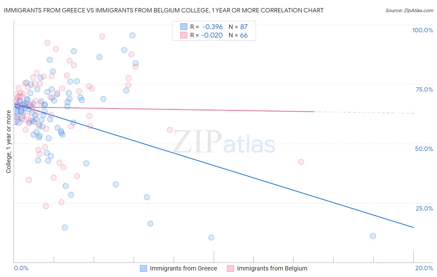 Immigrants from Greece vs Immigrants from Belgium College, 1 year or more Correlation Chart