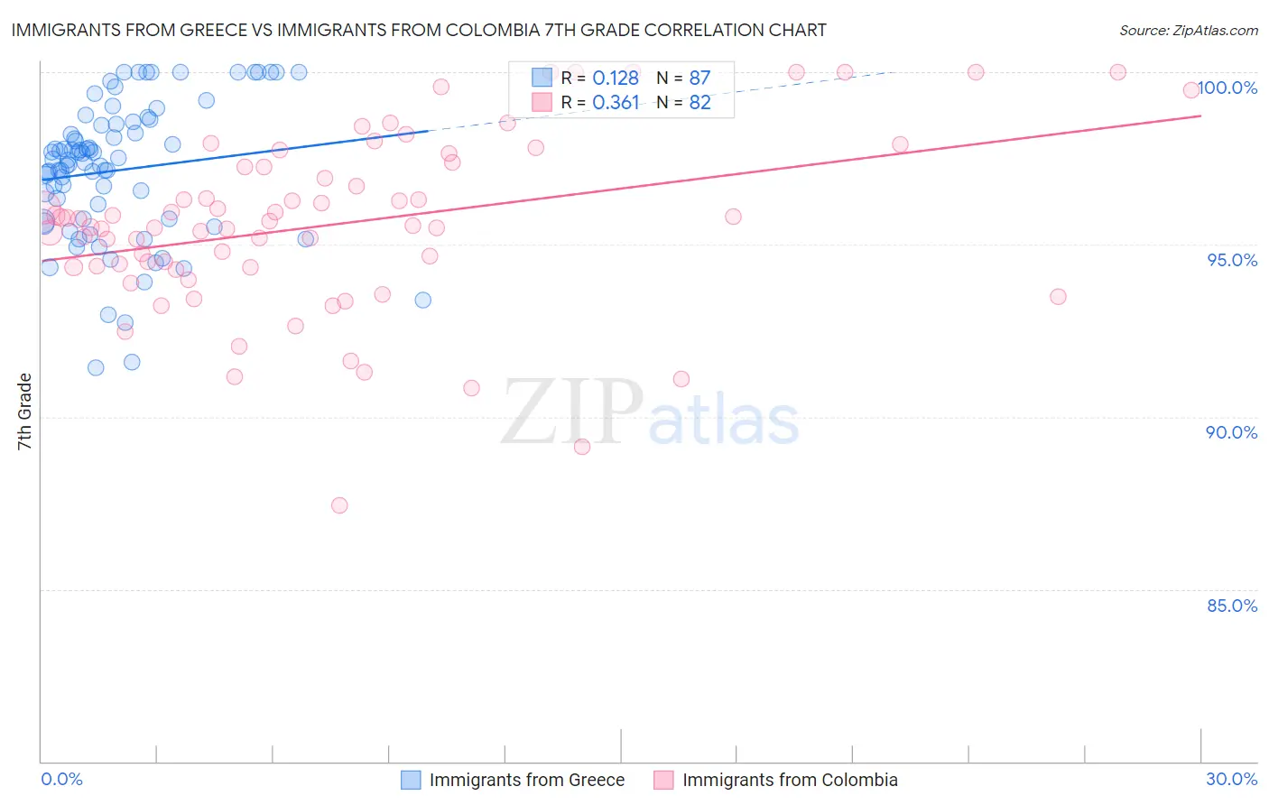 Immigrants from Greece vs Immigrants from Colombia 7th Grade Correlation Chart