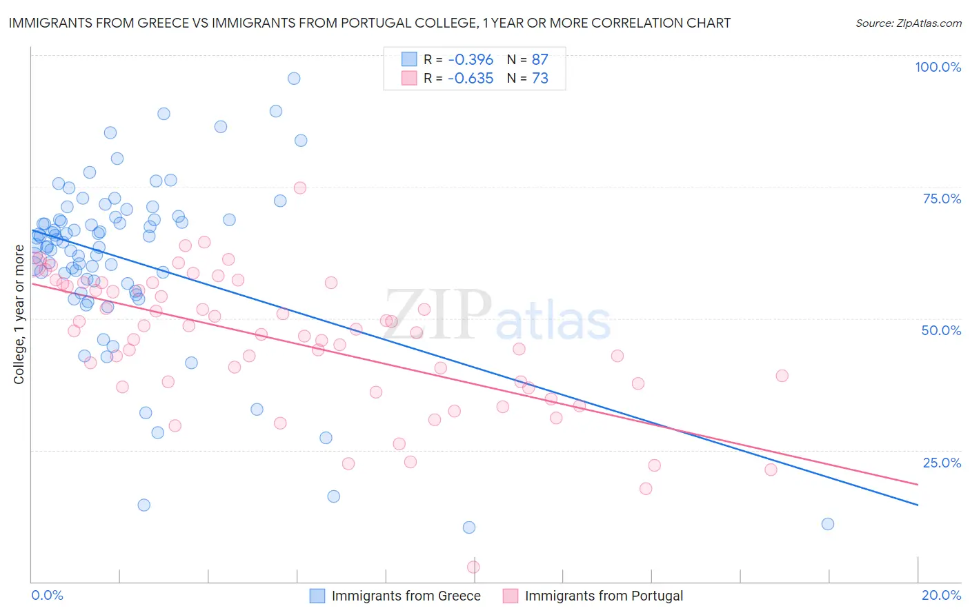 Immigrants from Greece vs Immigrants from Portugal College, 1 year or more Correlation Chart