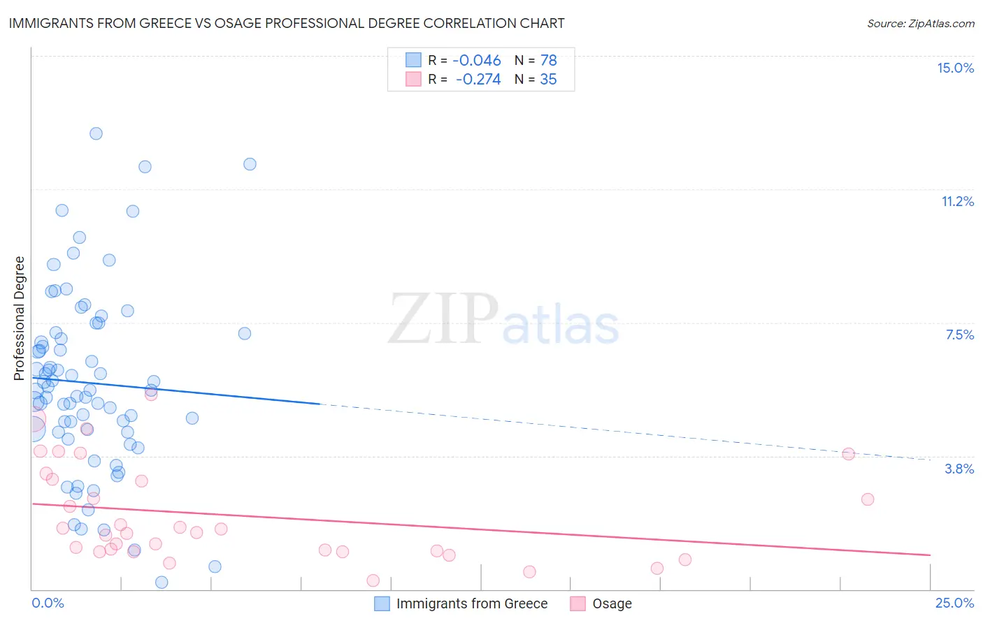 Immigrants from Greece vs Osage Professional Degree Correlation Chart