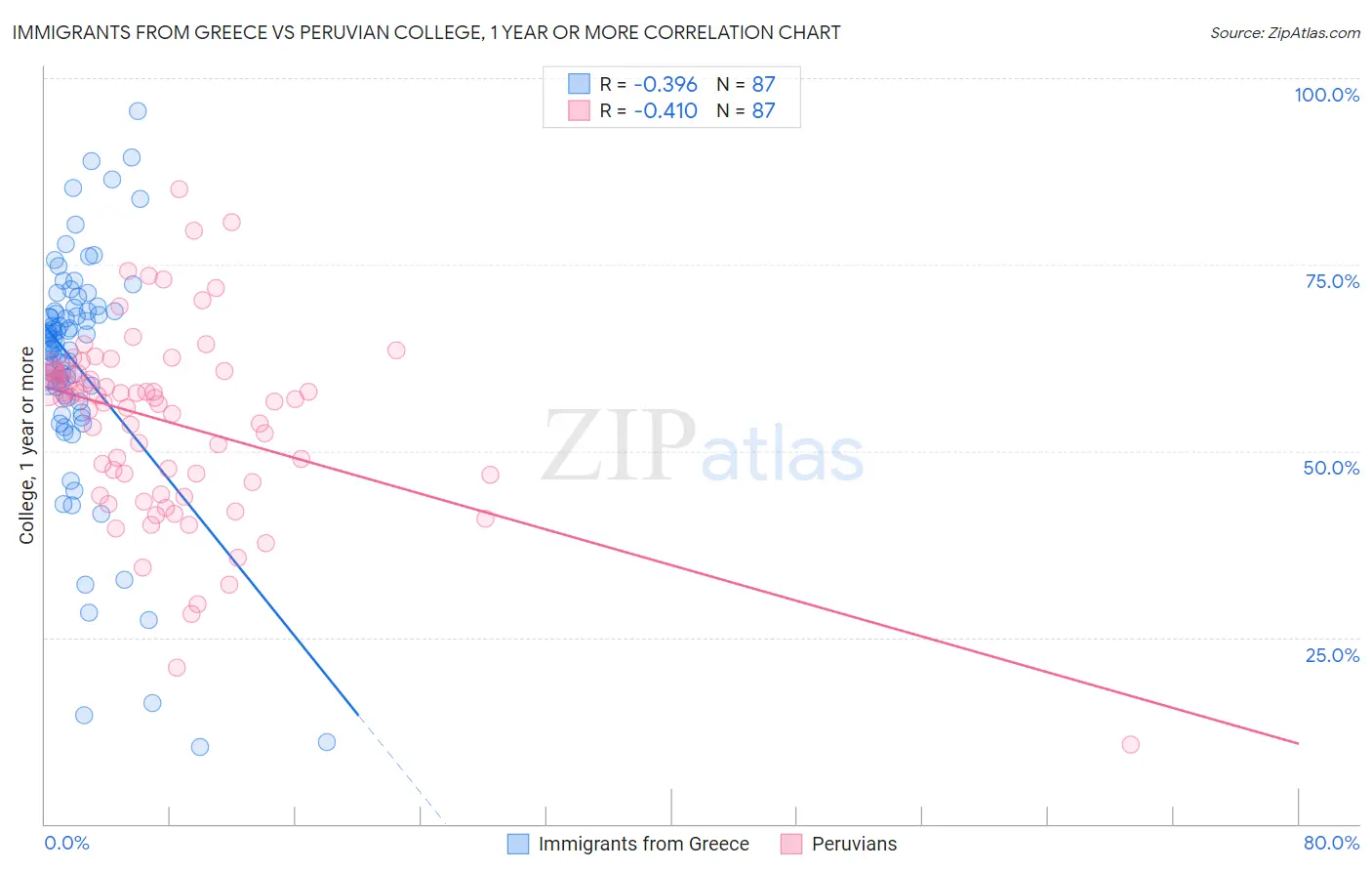 Immigrants from Greece vs Peruvian College, 1 year or more Correlation Chart