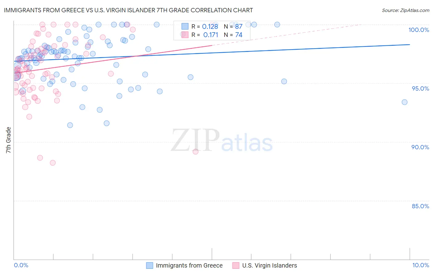 Immigrants from Greece vs U.S. Virgin Islander 7th Grade Correlation Chart