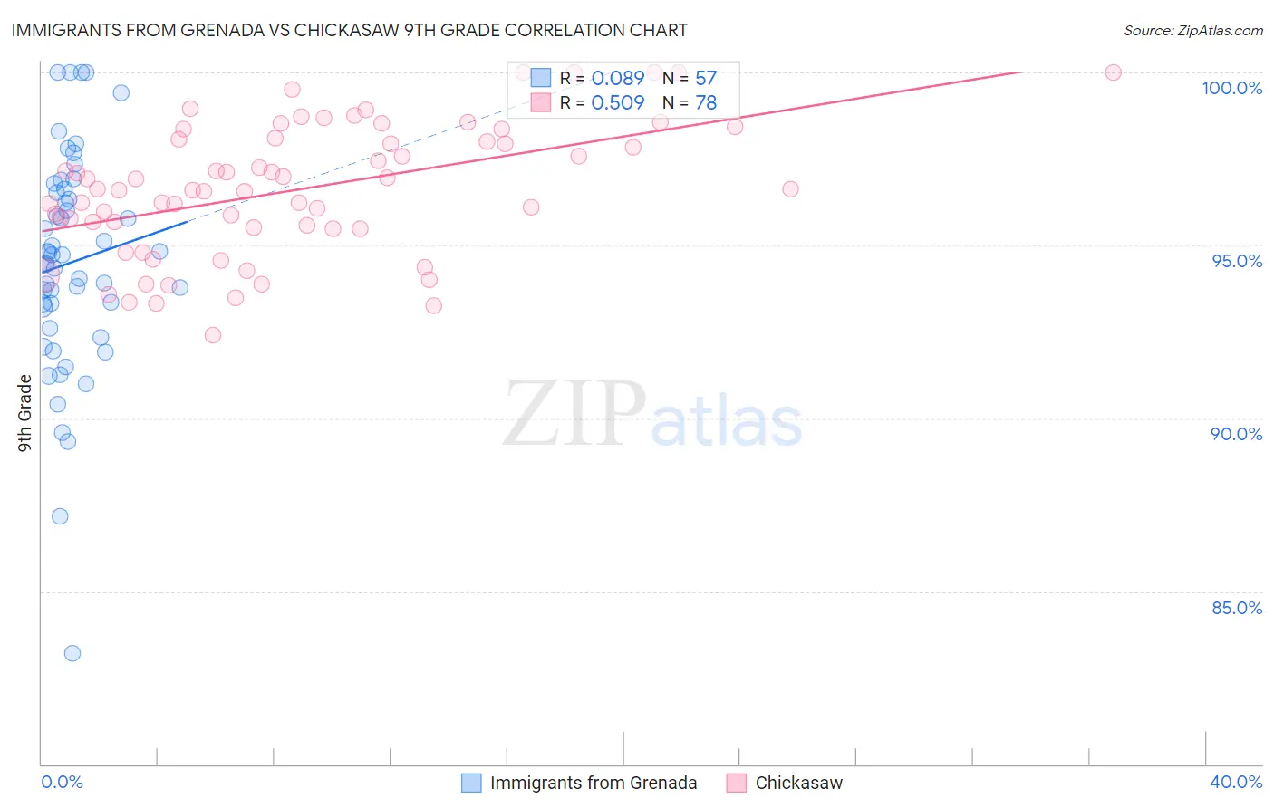 Immigrants from Grenada vs Chickasaw 9th Grade Correlation Chart