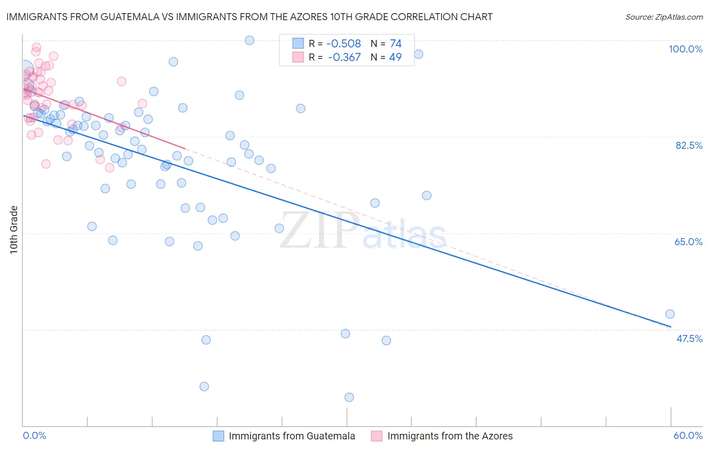 Immigrants from Guatemala vs Immigrants from the Azores 10th Grade Correlation Chart