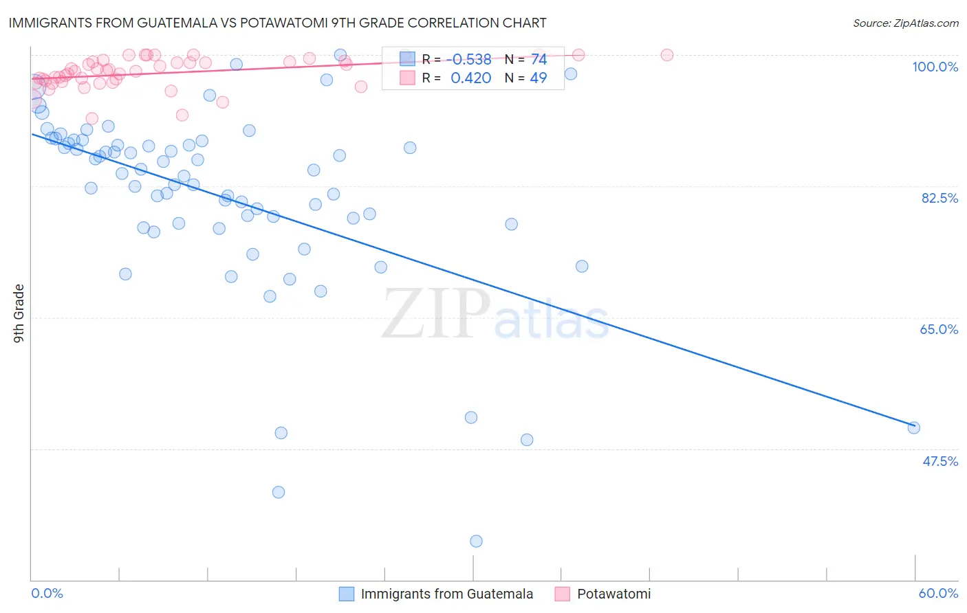 Immigrants from Guatemala vs Potawatomi 9th Grade Correlation Chart