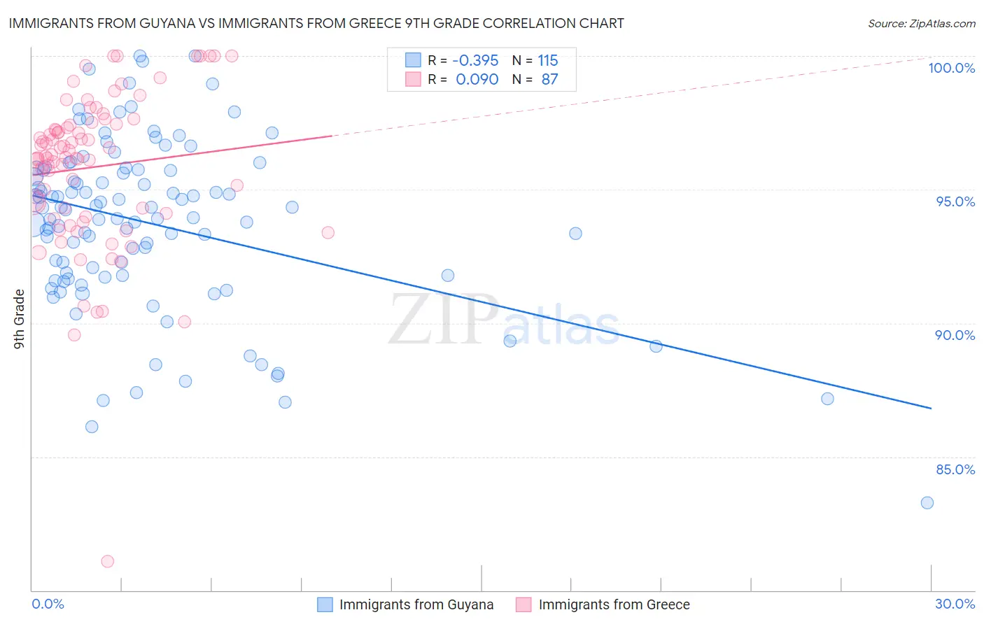 Immigrants from Guyana vs Immigrants from Greece 9th Grade Correlation Chart